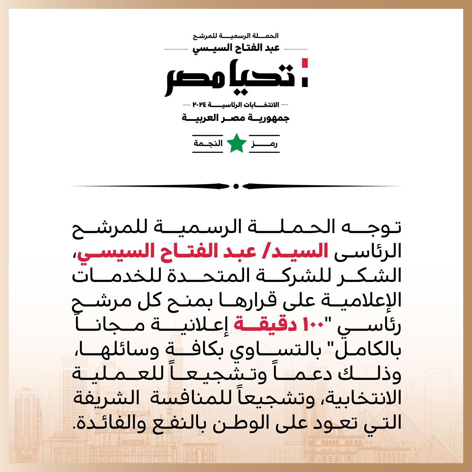 وجهت الحملة الرسمية للمرشح الرئاسي عبد الفتاح السيسي، الشكر للشركة المتحدة للخدمات الإعلامية على قرارها بمنح كل مرشح رئاسي "100 دقيقة إعلانية مجاناً بالكامل" بالتساوي بكافة وسائلها، وذلك دعمًا وتشجيعًا للعملية الانتخابية، وتشجيعاً للمنافسة الشريفة التي تعود على الوطن بالنفع والفائدة.