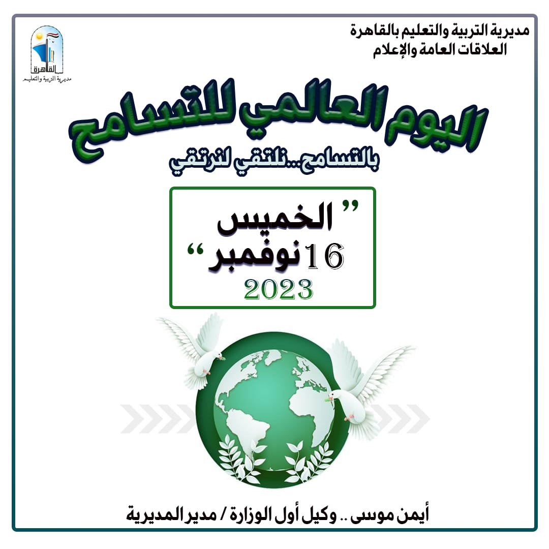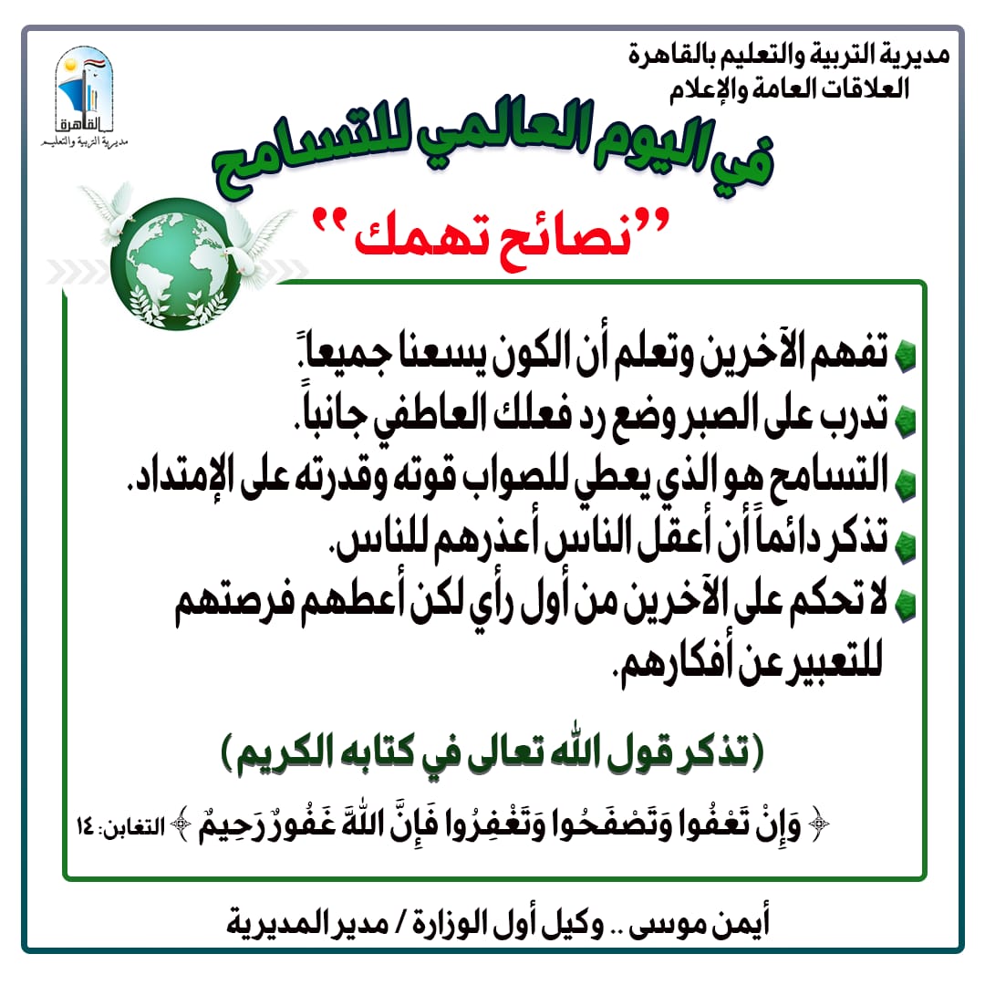 جددت مديرية التربية والتعليم بالقاهرة دعوة للحب والتسامح وحب العمل في اليوم الدولي للتسامح تحت شعار الإنسانية والعفو أعظم ما يتصف به المرء.