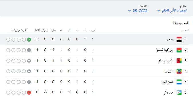 انتهت مباريات المجموعة الأولى من تصفيات إفريقيا المؤهلة إلى كأس العالم 2026، والتي تضم كلا من منتخبات مصر وبوركينا فاسو وغينيا بيساو وإثيوبيا وسيراليون وجيبوتي.