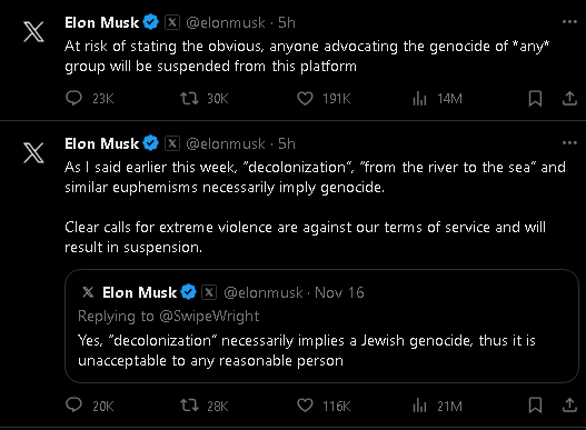 وسرعان ما نشر ماسك، اليوم السبت، تعليقًا على تغريدة نشرها يوم 16 نوفمبر، قال فيه: "قلت في الأسبوع الماضي كلمة "إنهاء الاستعمار" و "من البحر للنهر"، وهذه العبارات تعني بالضرورة الإبادة الجماعية. إن الدعوات الواضحة للعنف الشديد تتعارض مع شروط الخدمة الخاصة بنا وستؤدي إلى تعليق الحساب".