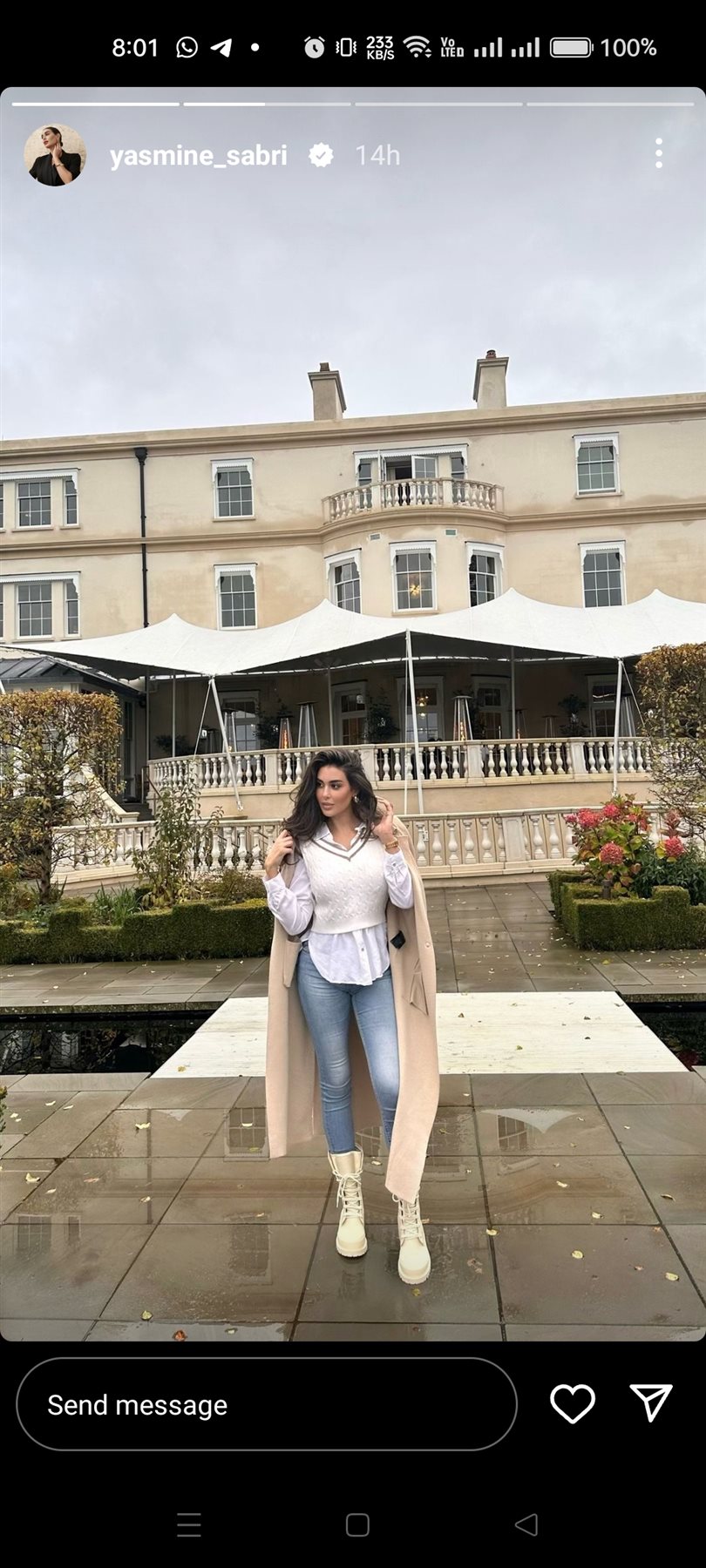 وظهرت ياسمين في الصورة بإطلالة شتوية متميزة مرتدية بالطو طويل وحذاء ذات رقبة ومعتمدة علي المكيب الهادي الذي أبرز جمال وجهها وانسدال خصلات شعرها السوداء علي كتفيها.