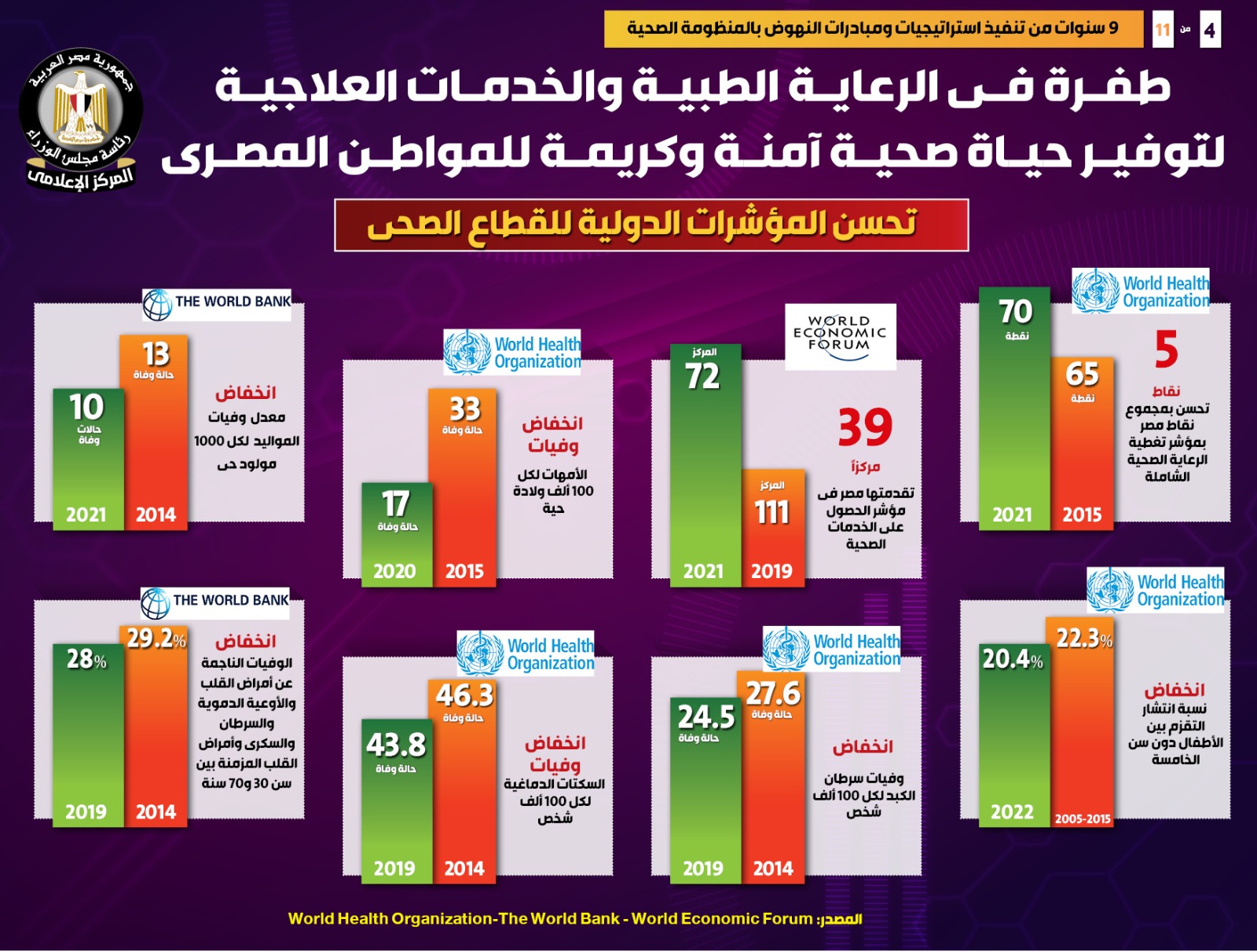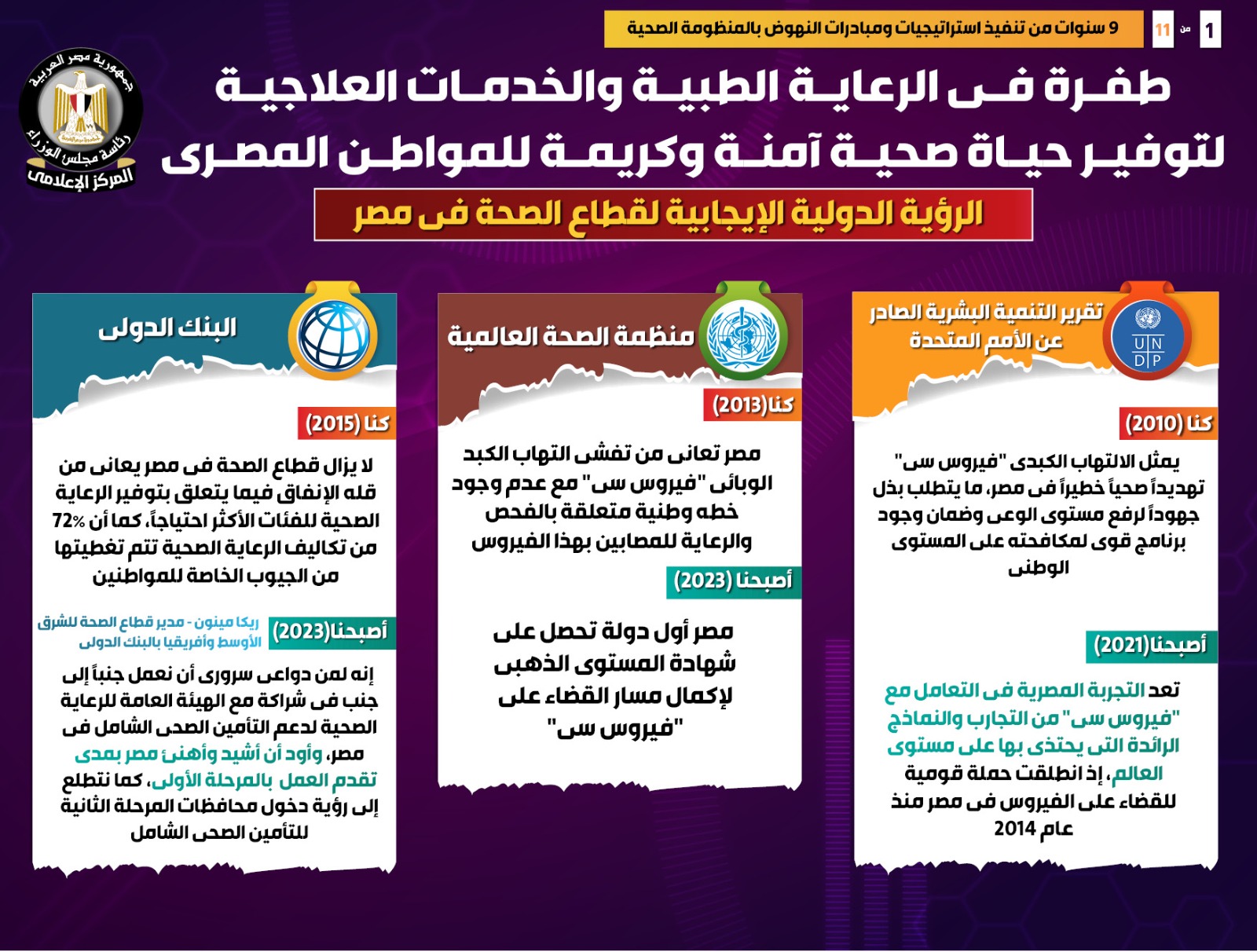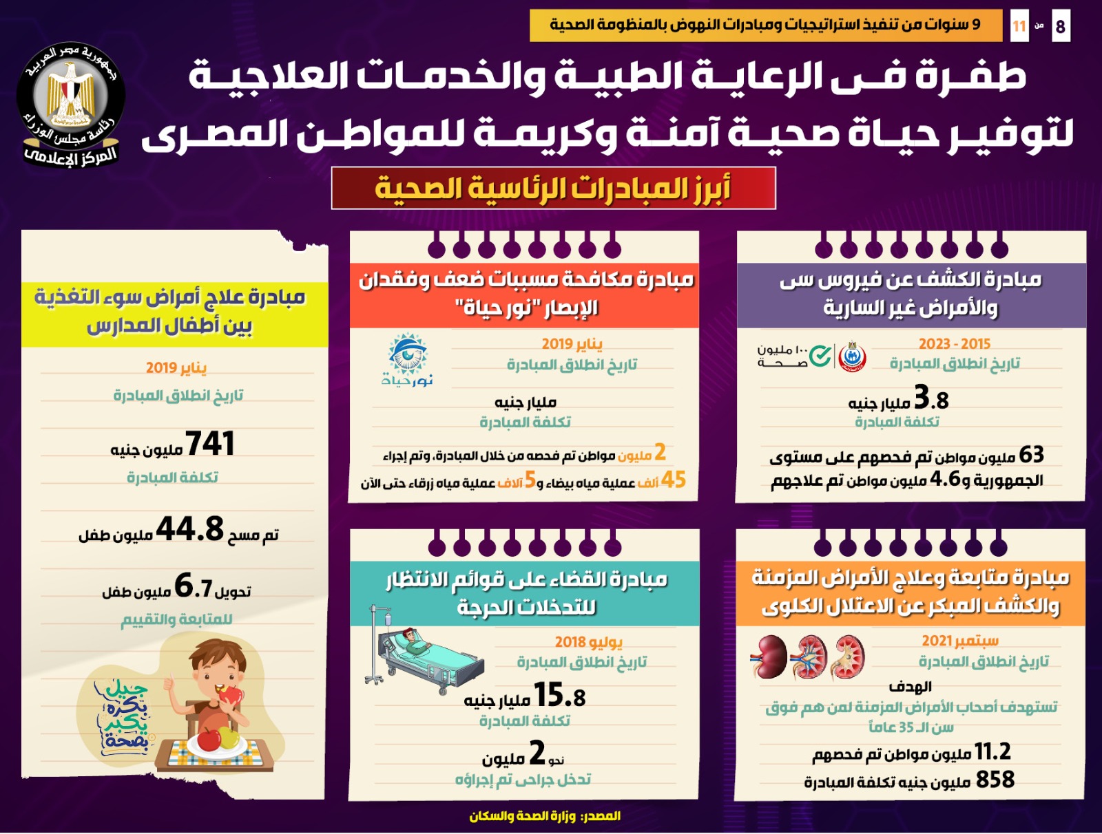 وفي هذا الصدد نشر المركز الإعلامي لمجلس الوزراء تقريراً تضمن إنفوجرافات تسلط الضوء على الطفرة التي شهدتها الرعاية الطبية والخدمات العلاجية لتوفير حياة صحية آمنة وكريمة للمواطن المصري، وذلك في ظل 9 سنوات من تنفيذ استراتيجيات ومبادرات النهوض بالمنظومة الصحية.