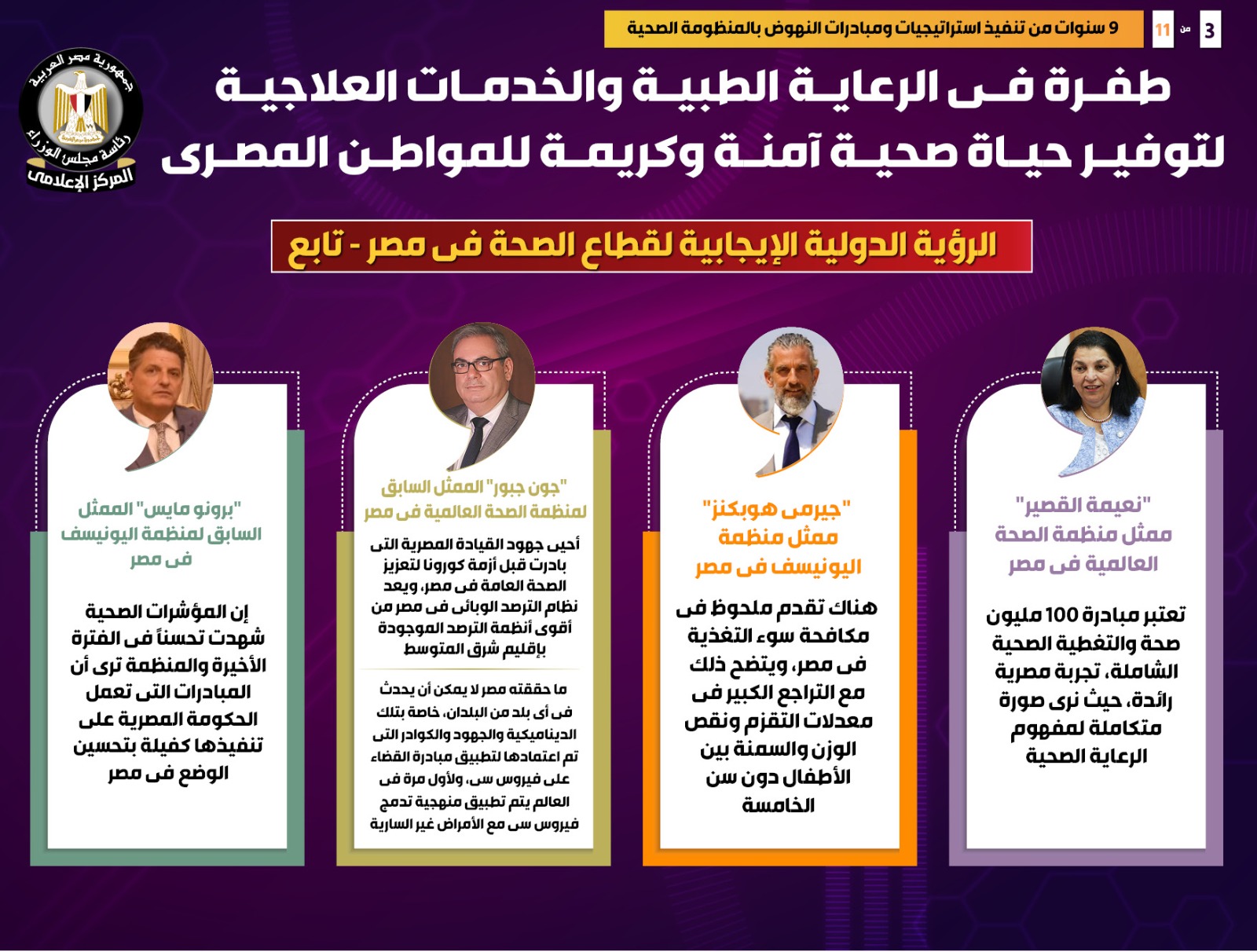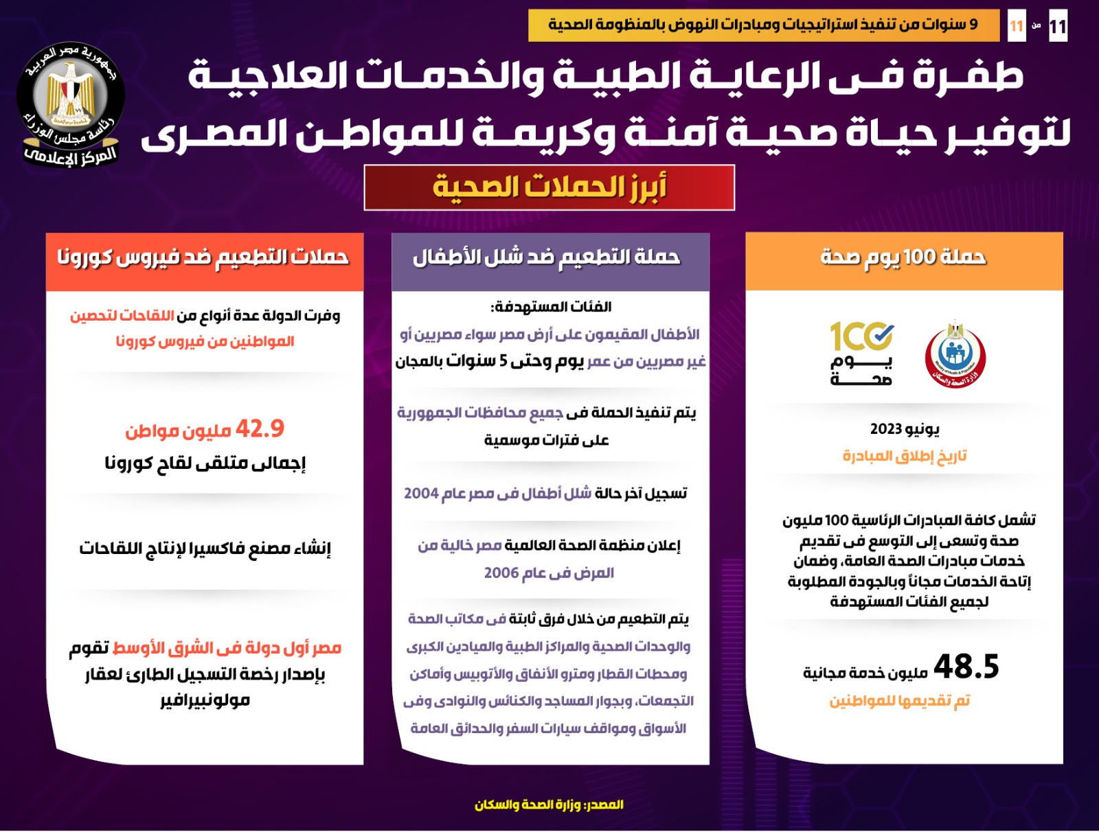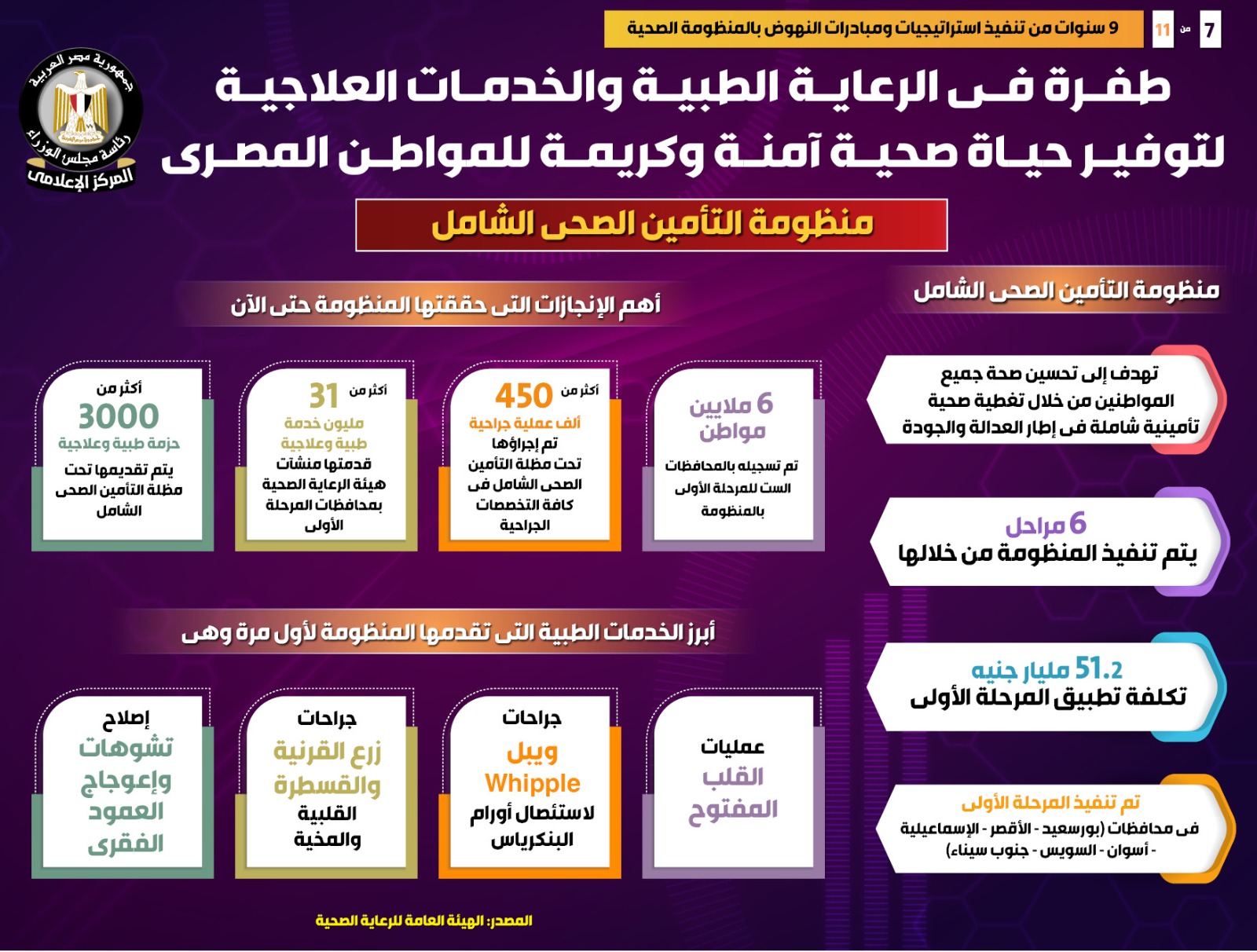 وفي هذا الصدد نشر المركز الإعلامي لمجلس الوزراء تقريراً تضمن إنفوجرافات تسلط الضوء على الطفرة التي شهدتها الرعاية الطبية والخدمات العلاجية لتوفير حياة صحية آمنة وكريمة للمواطن المصري، وذلك في ظل 9 سنوات من تنفيذ استراتيجيات ومبادرات النهوض بالمنظومة الصحية.