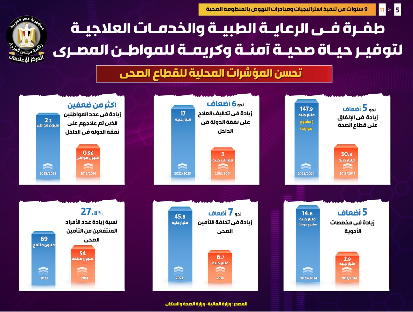 كما زاد عدد المواطنين الذين تم علاجهم على نفقة الدولة في الداخل بأكثر من ضعفين، ليسجل عددهم 2.2 مليون مواطن عام 2022/2023، مقارنة بـ 0.96 مليون مواطن عام 2013/2014، فضلاً عن زيادة مخصصات الأدوية 5 أضعاف لتسجل 14.6 مليار جنيه وفقاً لمشروع موازنة 2023/2024 مقارنة بـ 2.9 مليار جنيه عام 2013/2014.