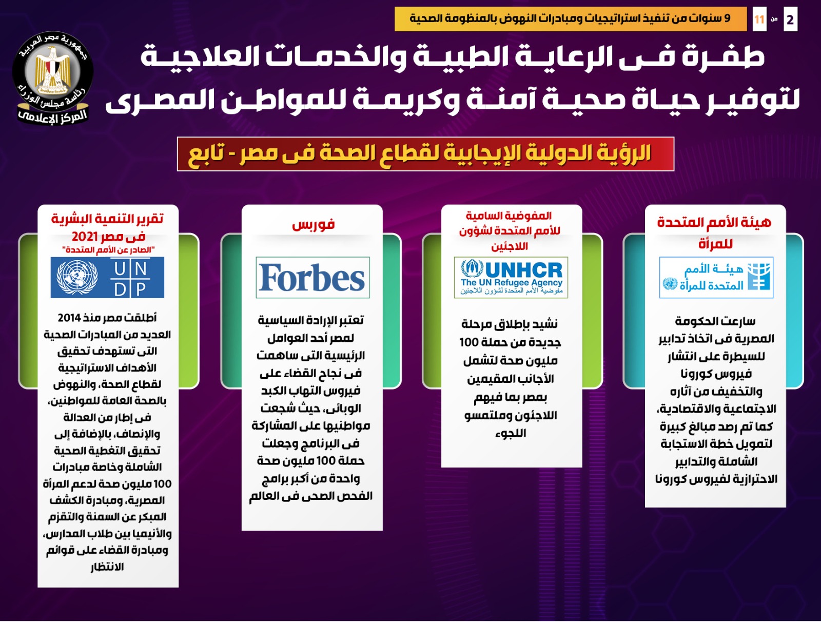 وبدورها أشادت المفوضية السامية للأمم المتحدة لشؤون اللاجئين بإطلاق مرحلة جديدة من حملة 100 مليون صحة لتشمل الأجانب المقيمين بمصر بما فيهم اللاجئون وملتمسو اللجوء.