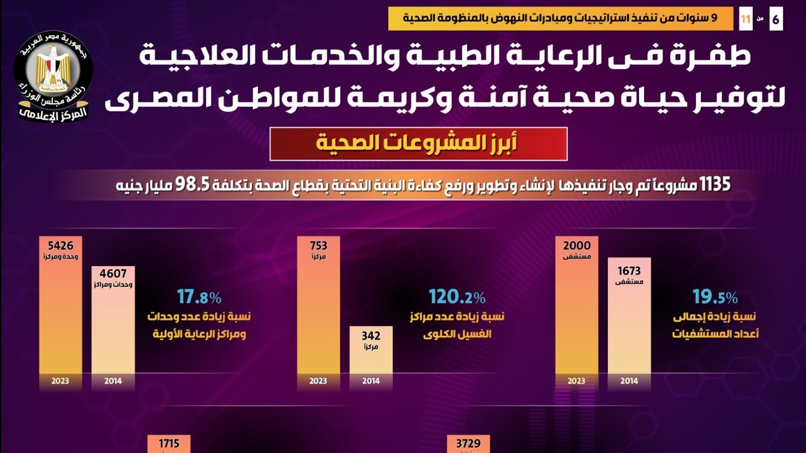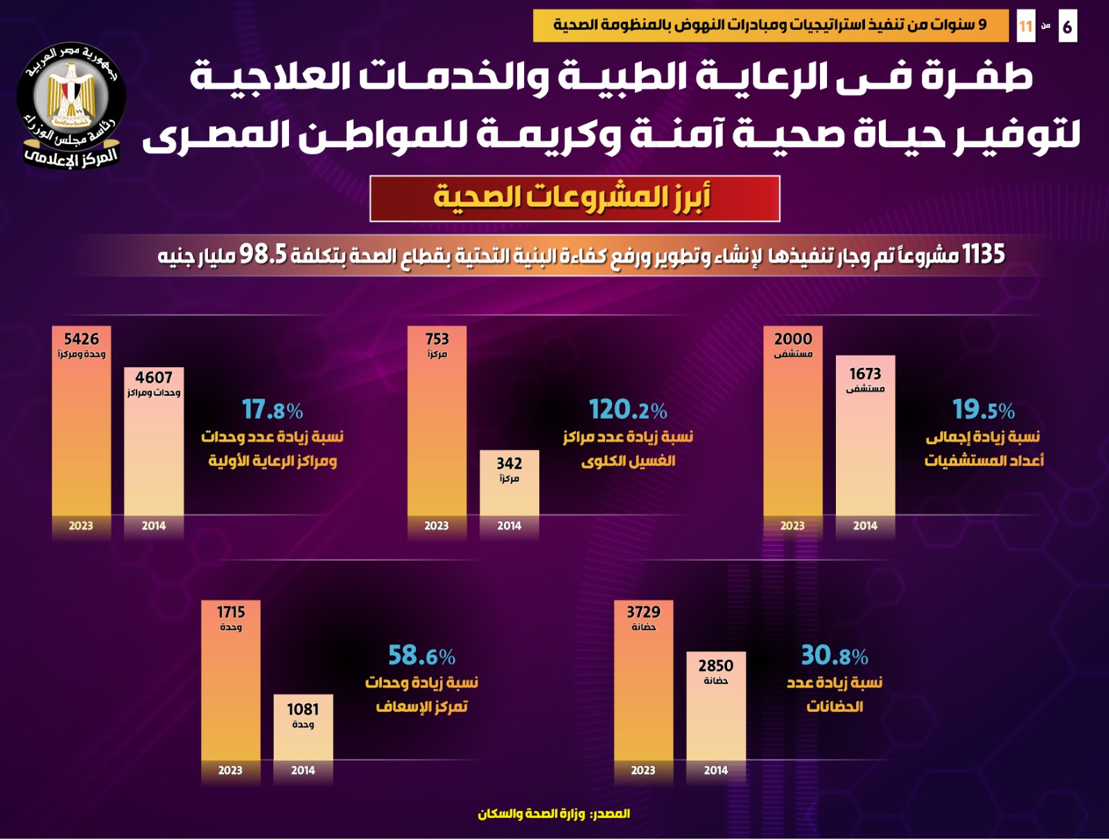 يأتي ذلك فيما زاد عدد الحضانات بنسبة 30.8%، لتسجل 3729 حضانة عام 2023 مقارنة بـ 2850 حضانة عام 2014، بينما ذاد عدد مراكز الغسيل الكلوي بنسبة 120.2%، لتسجل 753 مركزاً عام 2023 مقارنة بـ 342 مركزاً عام 2014.