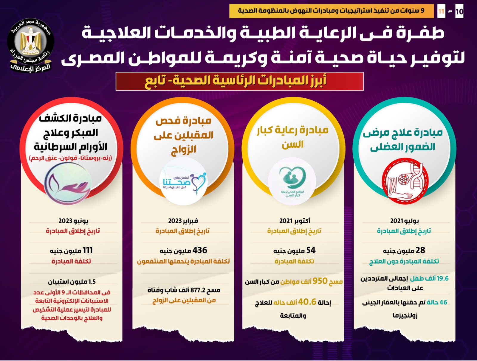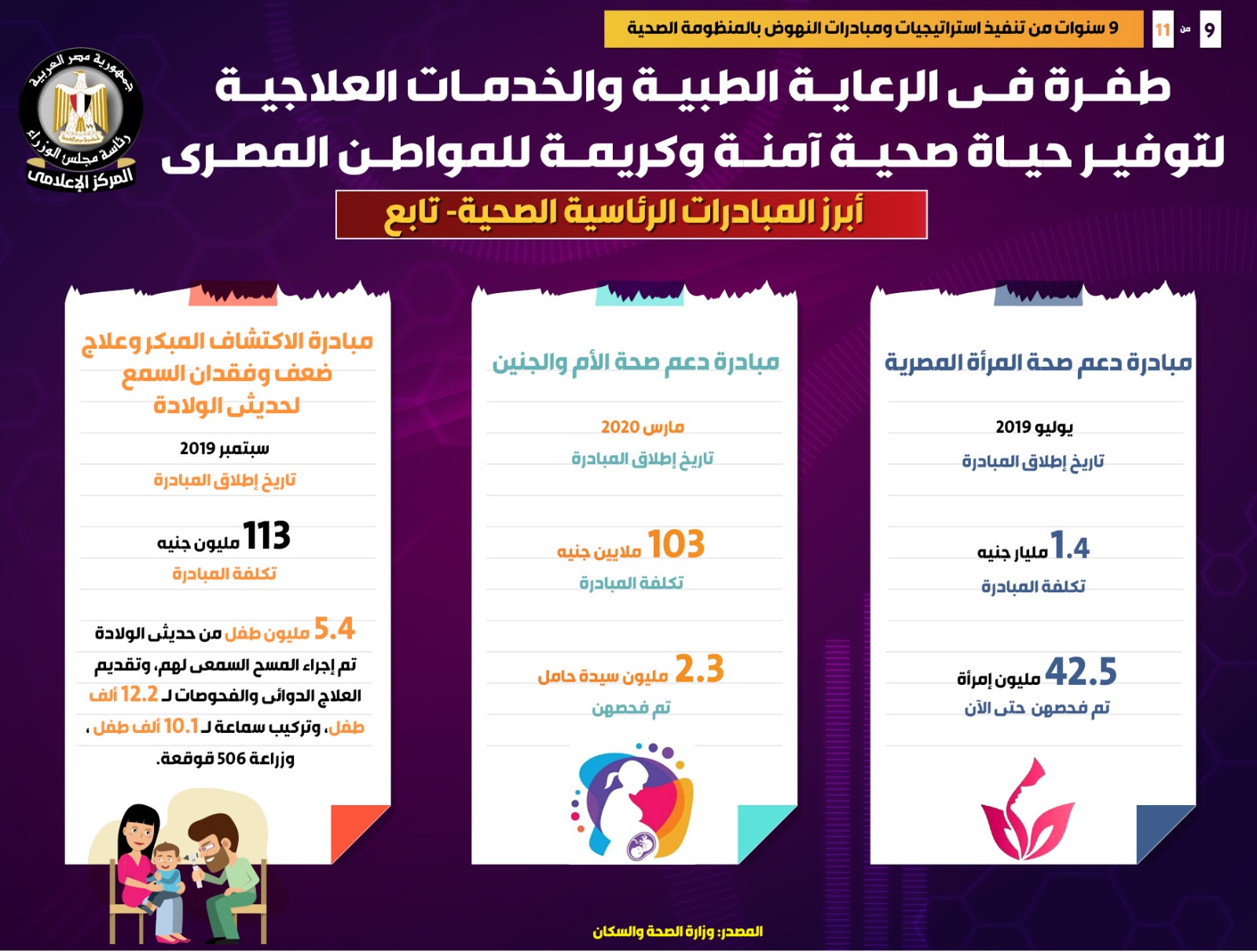 كما تم إطلاق مبادرة دعم صحة المرأة المصرية في يوليو 2019 وتم خلالها حتى الآن فحص 42.5 مليون امرأة، بتكلفة 1,4 مليار جنيه، بينما في سبتمبر 2019 تم إطلاق مبادرة الاكتشاف المبكر وعلاج ضعف وفقدان السمع لحديثي الولادة، وتم خلالها إجراء المسح السمعي لـ 5.4 مليون طفل، وتقديم العلاج الدوائي والفحوصات لـ 12.2 ألف طفل، وتركيب سماعة لـ 10.1 ألف طفل، وزراعة 506 قوقعة، بتكلفة 113 مليون جنيه، كما تم إطلاق مبادرة دعم صحة الأم والجنين في مارس 2020، وتم خلالها فحص 2.3 مليون سيدة حامل، بتكلفة بلغت 103 ملايين جنيه.
