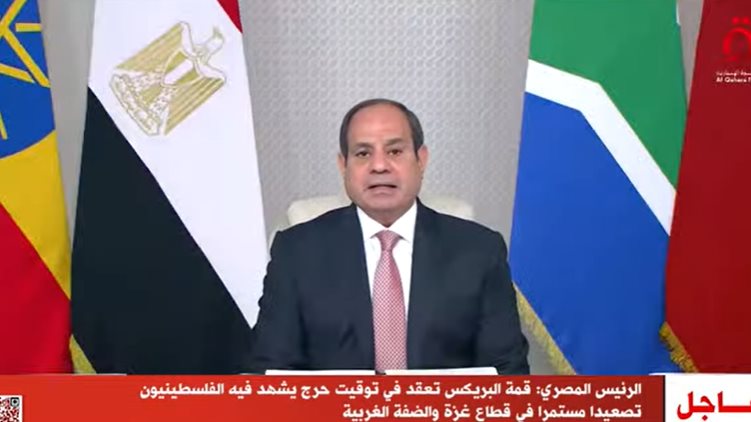 وقال الرئيس السيسي في كلمته امام مجموعة البريكس:" قطاع غزة تعرض بأكمله إلى عقاب جماعي وحصار وتجويع وضغوط من أجل التهجير القسري، وهذه المشاهد الإنسانية القاسية كشفت عجز المجتمع الدولي وجمود الضمير الإنساني".