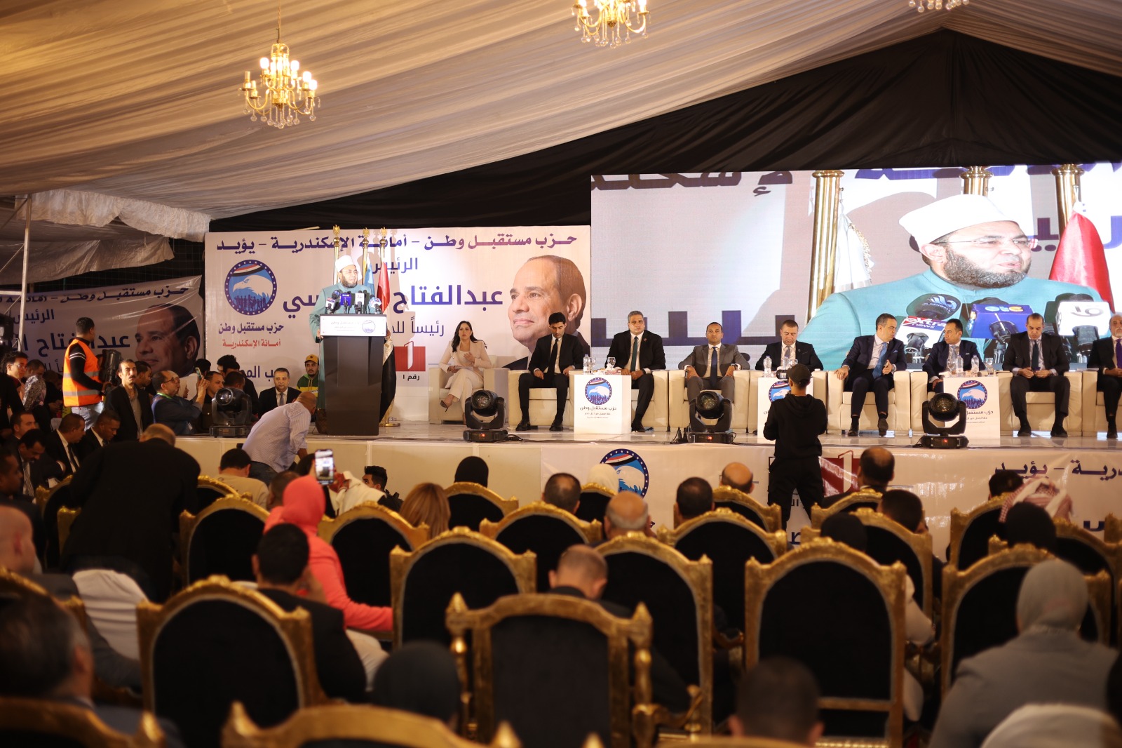 جاء ذلك خلال المؤتمر الجماهيري الحاشد الذي نظمه حزب مستقبل وطن بحضور أعضاء هيئة مكتب الحملة الانتخابية للمرشح الرئاسي عبد الفتاح السيسي برئاسة المستشار محمود فوزي ، والنائب عبدالهادي القصبي زعيم الأغلبية البرلمانية بمجلس النواب، والنائب علاء عابد نائب رئيس حزب مستقبل وطن والنائب عصام هلال عفيفي الأمين العام المساعد لحزب مستقبل وطن، والنائب أحمد دياب الأمين العام المساعد للحزب وأمين شئون الثقافة والفنون والرياضة، وعبد الحليم علام نقيب المحامين، والأنبا بافلي أسقف كنائس الإسكندرية والدكتور إبراهيم الجمل مسئول بيت العائلة المصري، وأعضاء الهيئة البرلمانية لمجلسي النواب والشيوخ بالإسكندرية، وأمناء الأقسام ولفيف من القيادات الشعبية والطبيعية شرقي الإسكندرية.