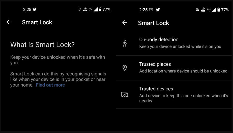 - يمكنك تشغيل القفل الذكي أو Smart Lock من خلال الانتقال إلى الإعدادات > ثم الأمان وشاشة القفل > ثم القفل الذكي، يمكنك الاختيار من بين ثلاثة خيارات للقفل الذكي هي: