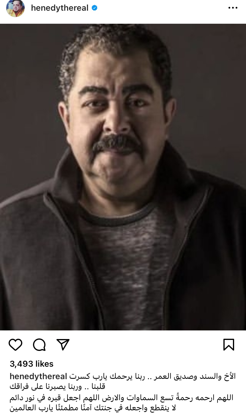 وكتب محمد هنيدى :"الأخ والسند وصديق العمر ، ربنا يرحمك يارب كسرت قلبنا ، وربنا يصبرنا على فراقك ، اللهم ارحمه رحمة تسع السماوات والأرض ، اللهم اجعل قبره فى نور دائم لاينقطع واجعله فى جنتك آمنا مطمئنًا يارب العالمين".