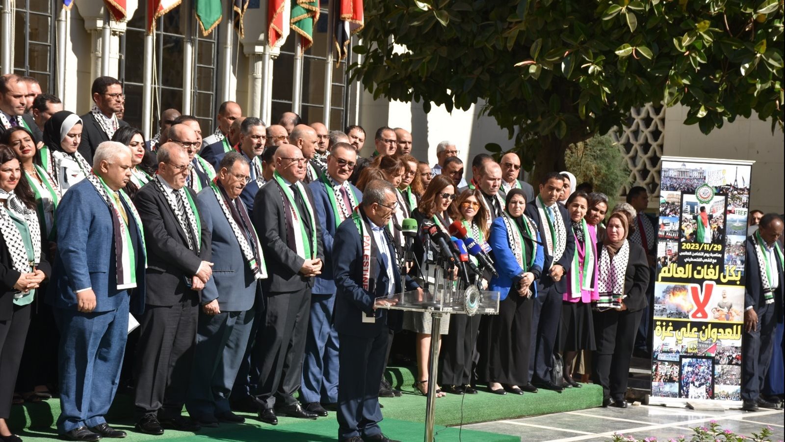 وفي كلمته، قال الرئيس الفلسطيني: "في هذا الوقت العصيب، الذي تمر به القضية الفلسطينية، وفي أحلك الأوقات ظلمة، يشع نور الأمل من المواقف المبدئية للشعوب التي هبت في كل أصقاع الأرض، لتعبر عن تضامنها مع الشعب الفلسطيني ومع نضاله وحقوقه المشروعة في الحرية والاستقلال والعودة، وإدانتها للعدوان والحرب والقتل والدمار والتهجير، ووقوفها الى الجانب الصحيح من التاريخ".