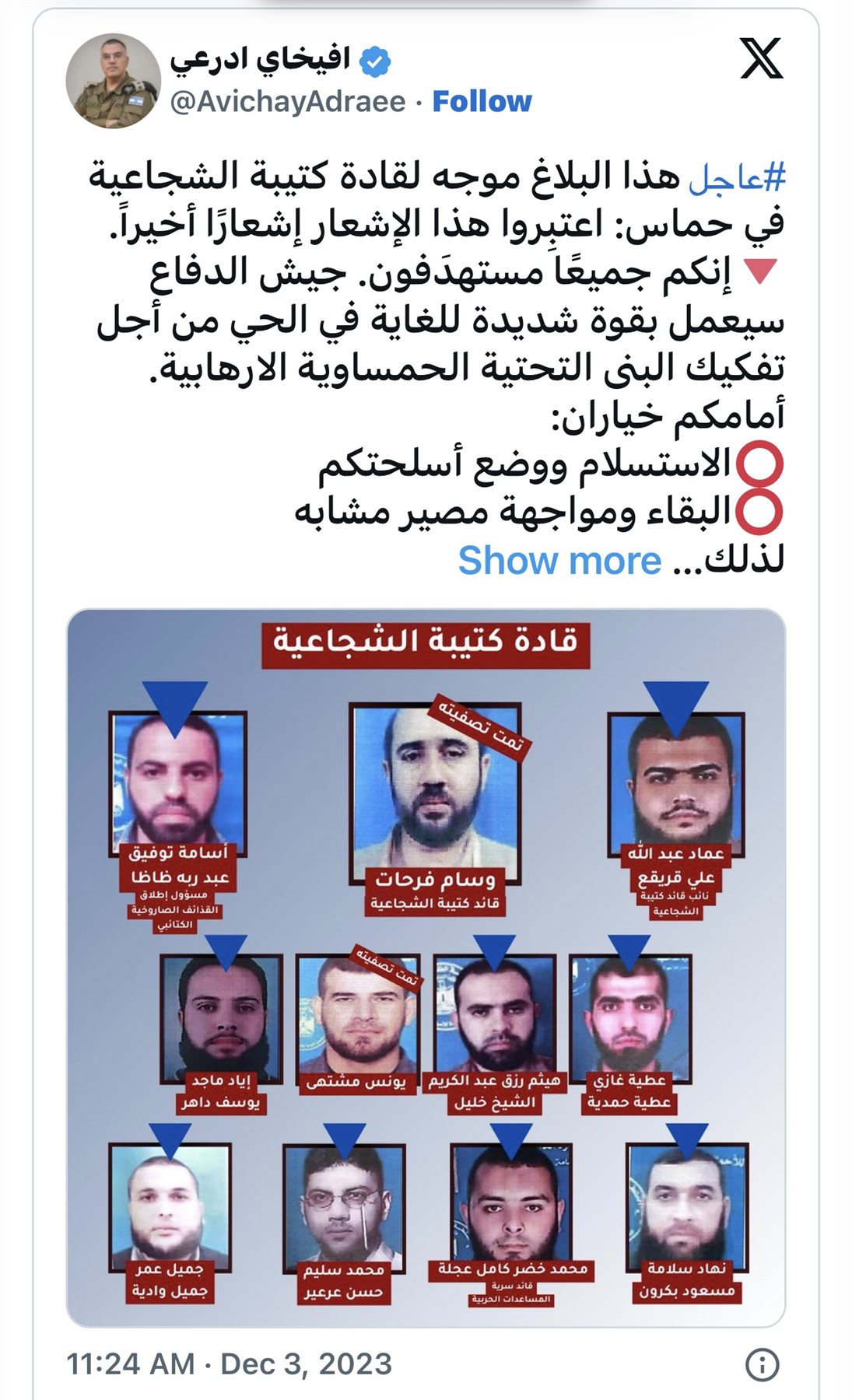 وأضاف أنه، "في إشارة إلى قائد كتيبة الشجاعية الذي قتل في غارة جوية إسرائيلية أمس: "لديكم خياران: الاستسلام وإلقاء أسلحتكم، أو مواجهة مصير مماثل لذلك الذي واجهه وسام فرحات".