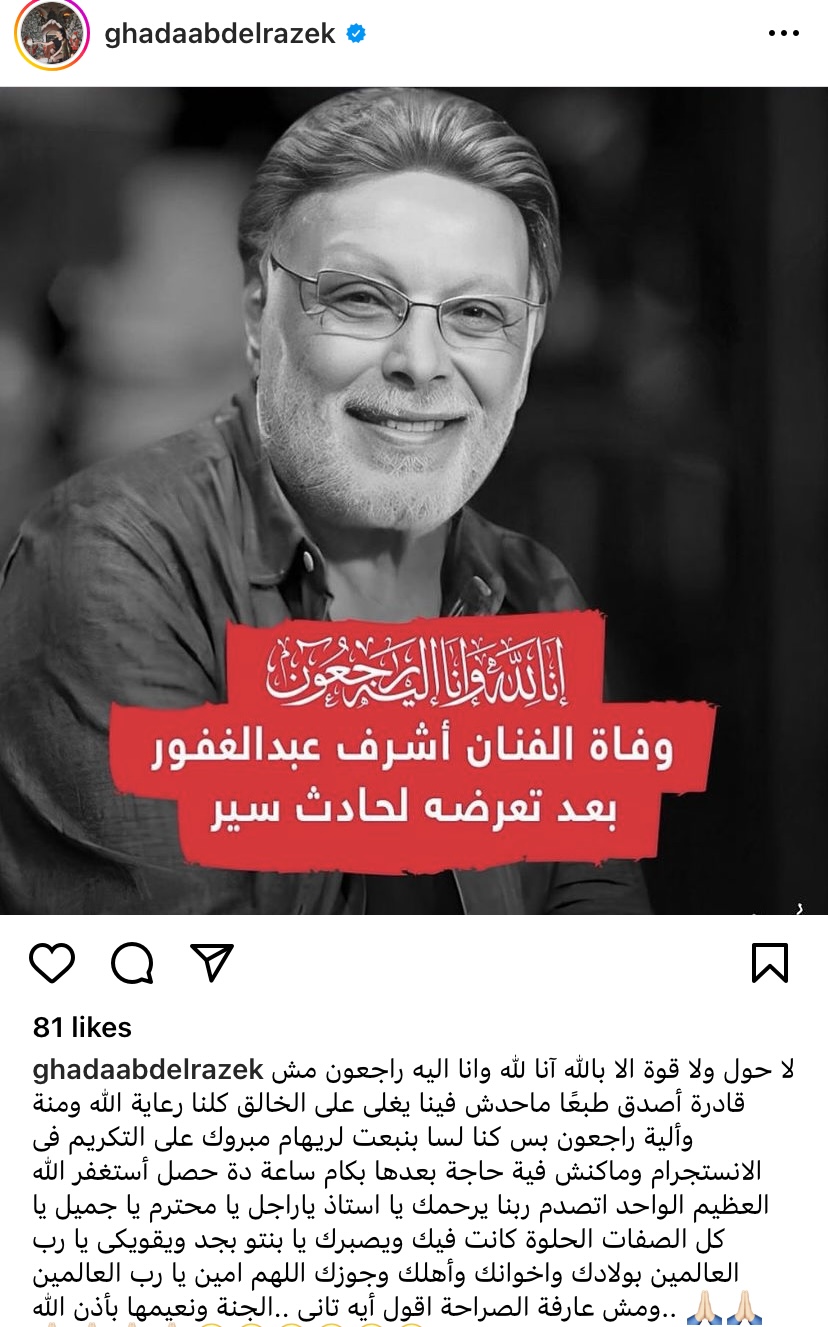 وكتبت غادة عبد الرازق عبر حسابها بتطبيق إنستجرام:" لا حول ولا قوة الا بالله آنا لله وانا اليه راجعون مش قادرة أصدق طبعًا ماحدش فينا يغلى على الخالق كلنا رعاية الله ومنة وإليه راجعون بس كنا لسه بنبعت لريهام مبروك على التكريم في الانستجرام وماكنش فيه حاجة بعدها بكام ساعة ده حصل أستغفر الله العظيم الواحد اتصدم ربنا يرحمك يا استاذ ياراجل يا محترم یا جمیل یا كل الصفات الحلوة كانت فيك ويصبرك يا بنتو بجد ویقویکی یا رب العالمين بولادك واخوانك وأهلك وجوزك اللهم امین یارب العالمین ..ومش عارفة الصراحة اقول أيه تاني ..الجنة ونعيمها بأذن الله".