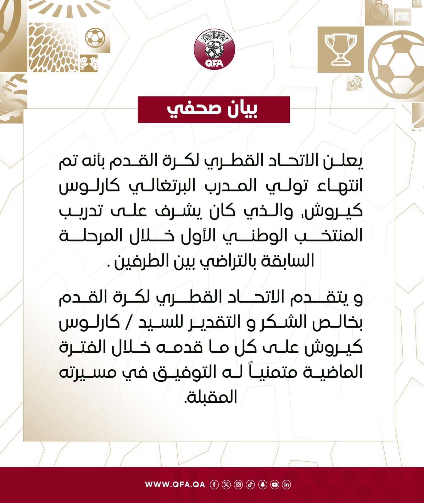 وجاء في البيان أن الاتحاد القطري يقدم الشكر للمدرب البرتغالي على تلك الفترة التي قاد فيها المنتخب القطري