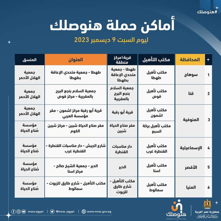 وكما يوضح الانفوجراف التالي، تفاصيل حملة "هنوصلك" لاستخراج بطاقة الخدمات المتكاملة للمستحقين في العناوين الموضحة بالجدول أدناه.