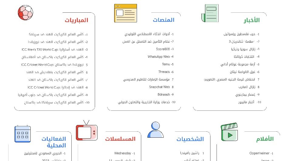 السعودية: بحث الأفراد في المملكة عن كرة القدم بسبب الفعاليات المتعددة التي حدثت خلال العام، وقد تصدرت المباراة التي جمعت الهلال السعودي وريال مدريد قائمة المباريات الأكثر بحثًا. أما عن قائمة الشخصيات، فقد كان لكرة القدم نصيب فيها بوجود لاعبين مثل ميتروفيتش وكريم بنزيما في أعلى القائمة. تصدرت قائمة الأخبار الأكثر رواجًا لهذا العام الحرب في فلسطين، كما ضمت القائمة انخفاض قيمة الروبية الباكستانية، ومرض بورغر. كما بحث الناس في المملكة عن المنصات المحلية وأبرزها أبشر، جدارات واعتماد وغيرها من المواقع.