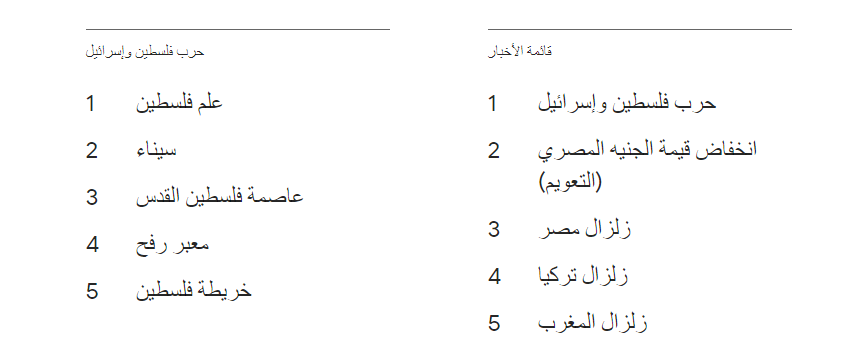 وبحسب شركة جوجل فقد تضمن البحث عن موضوع الحرب عدة موضوعات أخرى مثل علم فلسطين، وسيناء، وعاصمة فلسطين القدس، ومعبر رفح، وخريطة فلسطين.