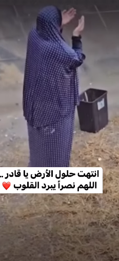 وظهرت المرأة الفلسطينية في مقطع الفيديو الذي فطر القلوب وهي تدعو الله رافعة يديها إلى السماء وقت نزول المطر .