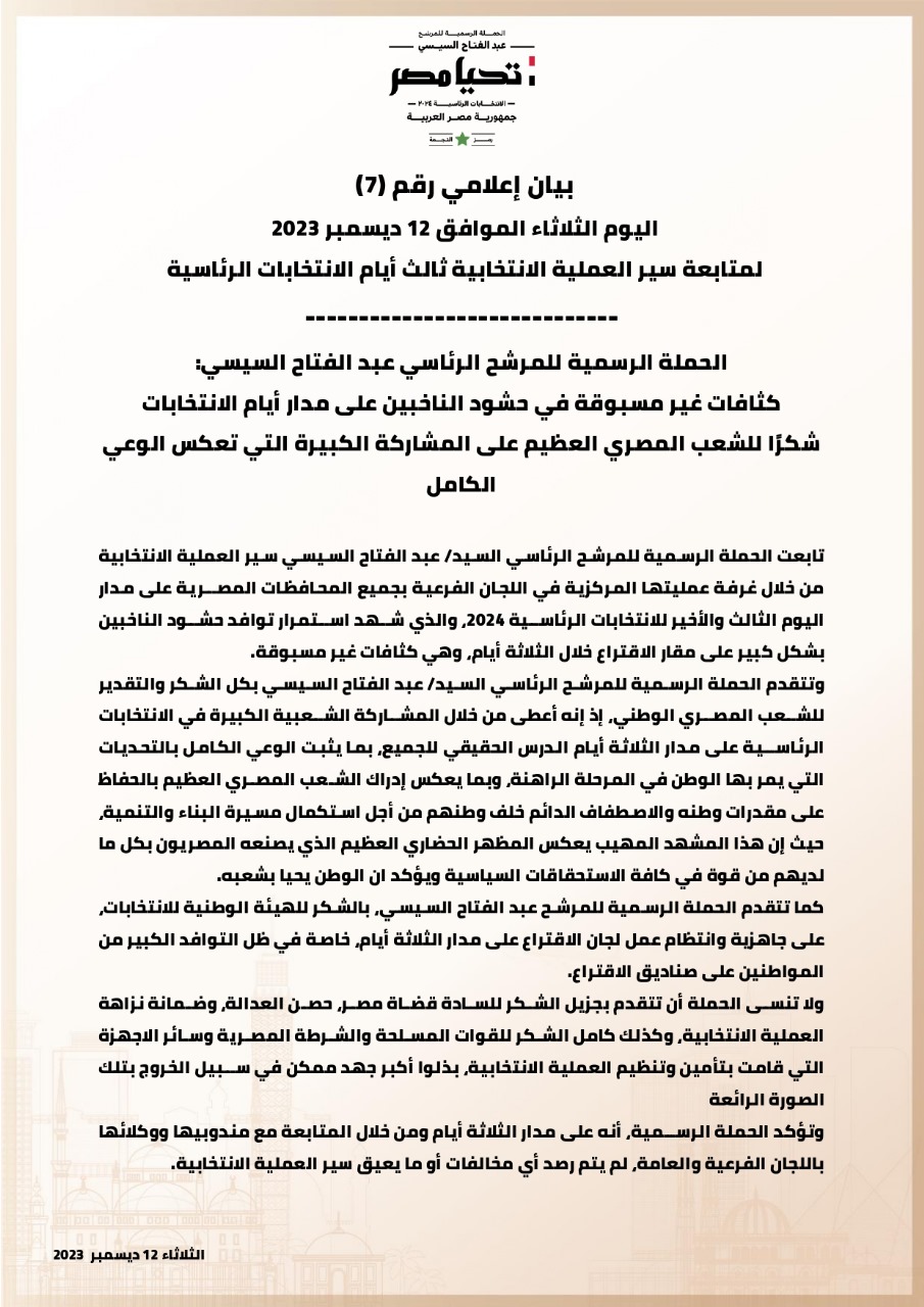 تابعت الحملة الرسمية للمرشح الرئاسي عبد الفتاح السيسي سير العملية الانتخابية من خلال غرفة عمليتها المركزية في اللجان الفرعية بجميع المحافظات المصرية على مدار اليوم الثالث والأخير للانتخابات الرئاسية 2024، والذي شهد استمرار توافد حشود الناخبين بشكل كبير على مقار الاقتراع خلال الثلاثة أيام، وهي كثافات غير مسبوقة.