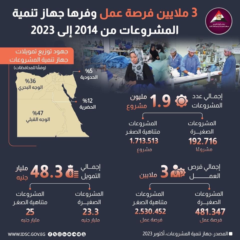 وأضاف أن جهاز تنمية المشروعات حقق إنجازات كبيرة خلال العام المالي 2022/2023، حيث بلغت قيمة التمويلات الممنوحة للمشروعات الصغيرة ومتناهية الصغر 48.3 مليار جنيه، لتمويل أكثر من 1.9 مليون مشروع، وتوفير أكثر من 3 ملايين فرصة عمل.