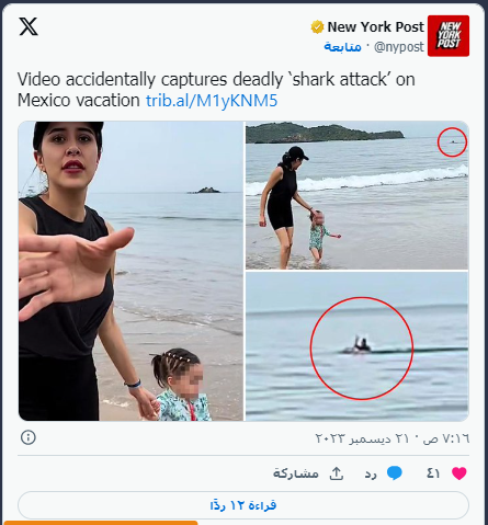 وقالت لوفيانو والتي قامت بتصوير مقطع الفيديو بالصدفة: "كنا نستمتع بالصباح على الشاطئ، ليسمعوا شيئا ما في البحر"، مضيفة أنه بعد ذلك تم القيام بإنقاذ الرجل إلا أنه كان ينزف بشكل كبيروتوفي الرجل بسبب نزيف الدم