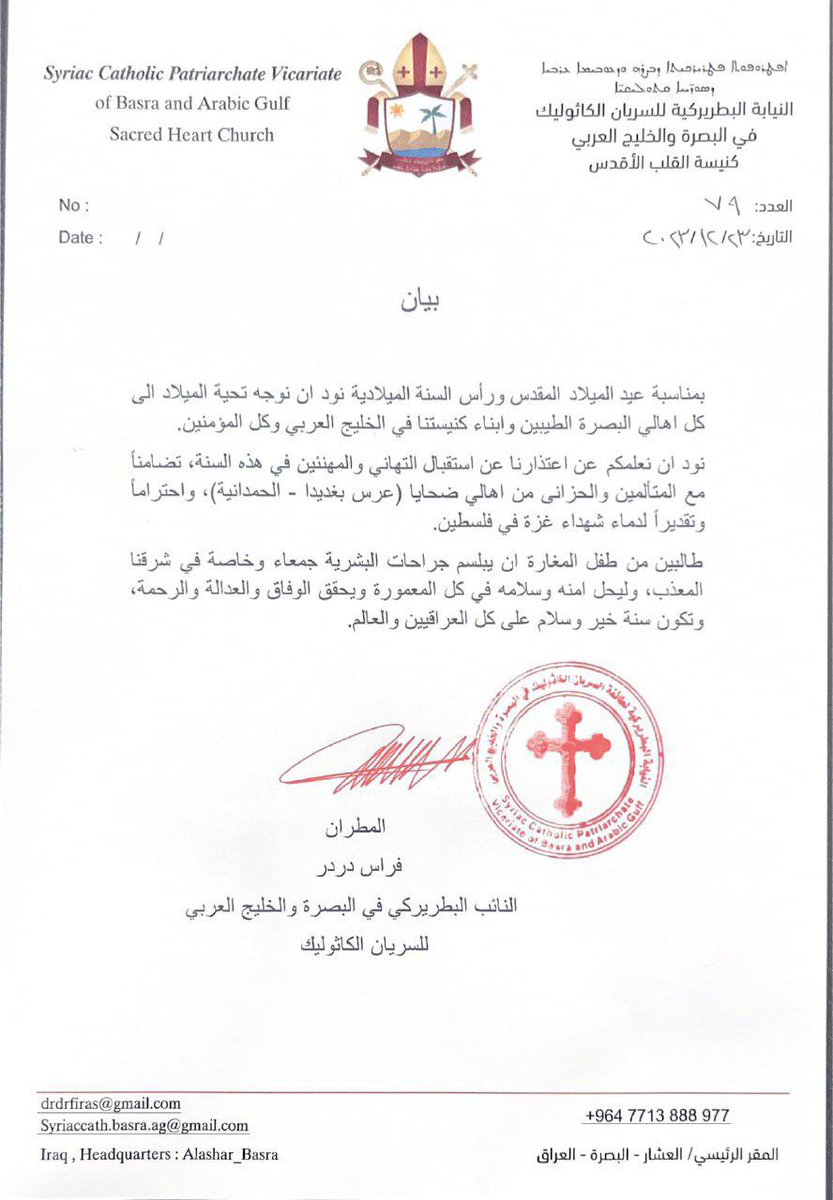 جاء في البيان: "نتقدم بالتهنئة بمناسبة عيد الميلاد المجيد إلى كل أهل البصرة الطيبين وأعضاء كنيستنا في الخليج العربي وجميع المؤمنين، ونود أن نعلمكم بقرارنا الاعتذار عن استقبال التهاني والمهنئين هذا العام تضامناً مع ألم وحزن أهالي ضحايا بغديدا – الحمدانية، واحتراماً وتقديراً لدماء الشهداء في غزة فلسطين.