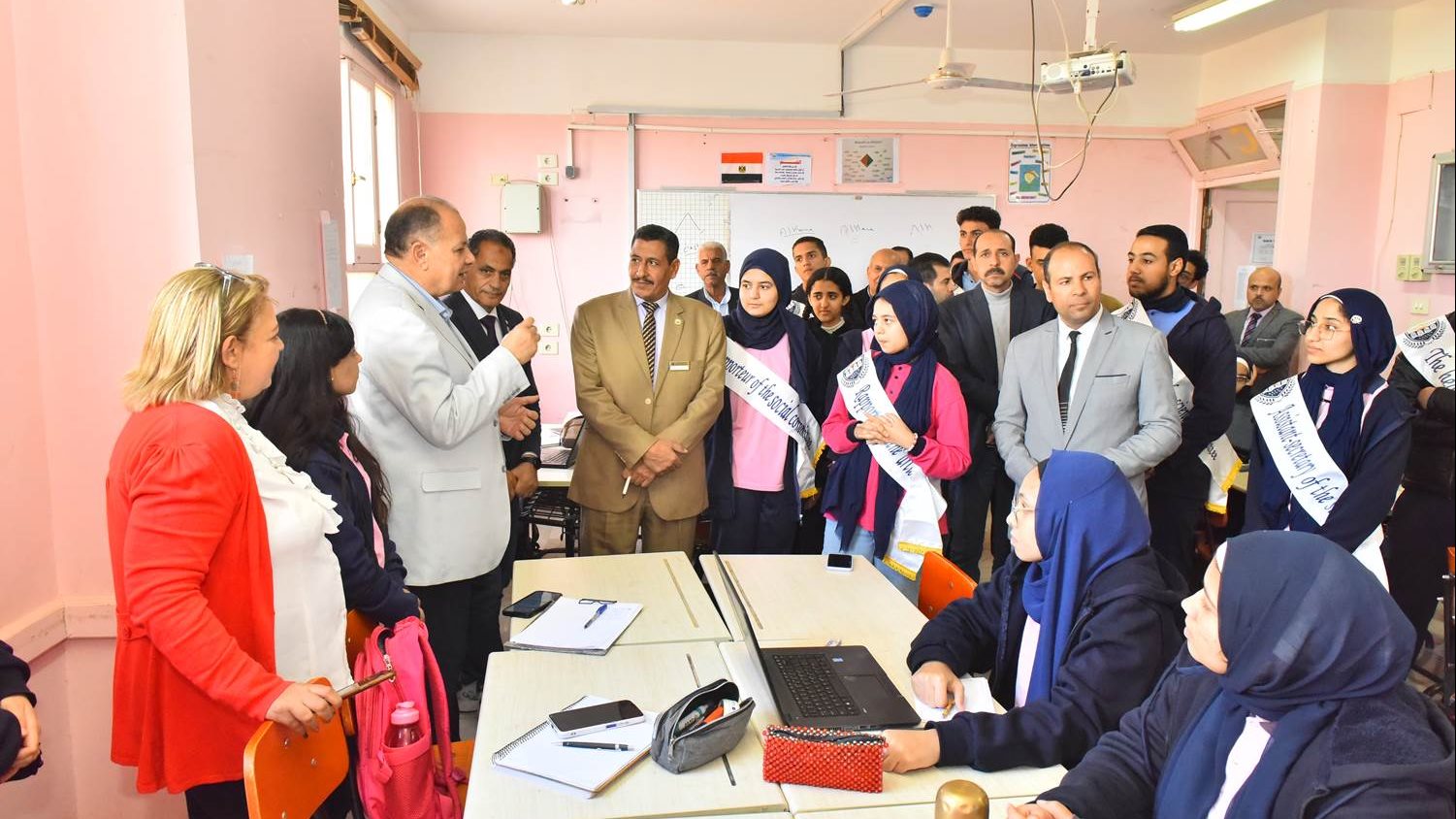 رافقه خلال الجولة التفقدية عبدالعزيز زنار وكيل وزارة التربية والتعليم بالمحافظة ومحمد إبراهيم دسوقي وكيل مديرية التربية والتعليم ومحمد النمر مدير عام التعليم الفني وسيد الشريف مدير عام الشئون التنفيذية بالمديرية، وعيون إبراهيم رئيس حي غرب، وعلاء خضراوي مدير إدارة الأمن بمديرية التربية والتعليم والدكتور ضيف الله حسن المدير التنفيذي للمدارس والدكتور عبدالرحمن عليوة مدير إدارة المدرسة.