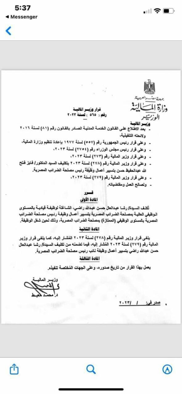 كشف القرار برقم 565 لسنة 2023 الصادر عن وزير المالية وحصل صدي البلد علي نسخة منه، إلغاء القرارات السابقة بتكليف رشا عبد العال كنائب لرئيس المصلحة، واستمرارها بتسيير أعمال مصلحة الضرائب لحين شغل الوظيفة بالتعيين أو بلوغها السن القانونية للتقاعد أو لحين شغل الوظيفة من آخر .