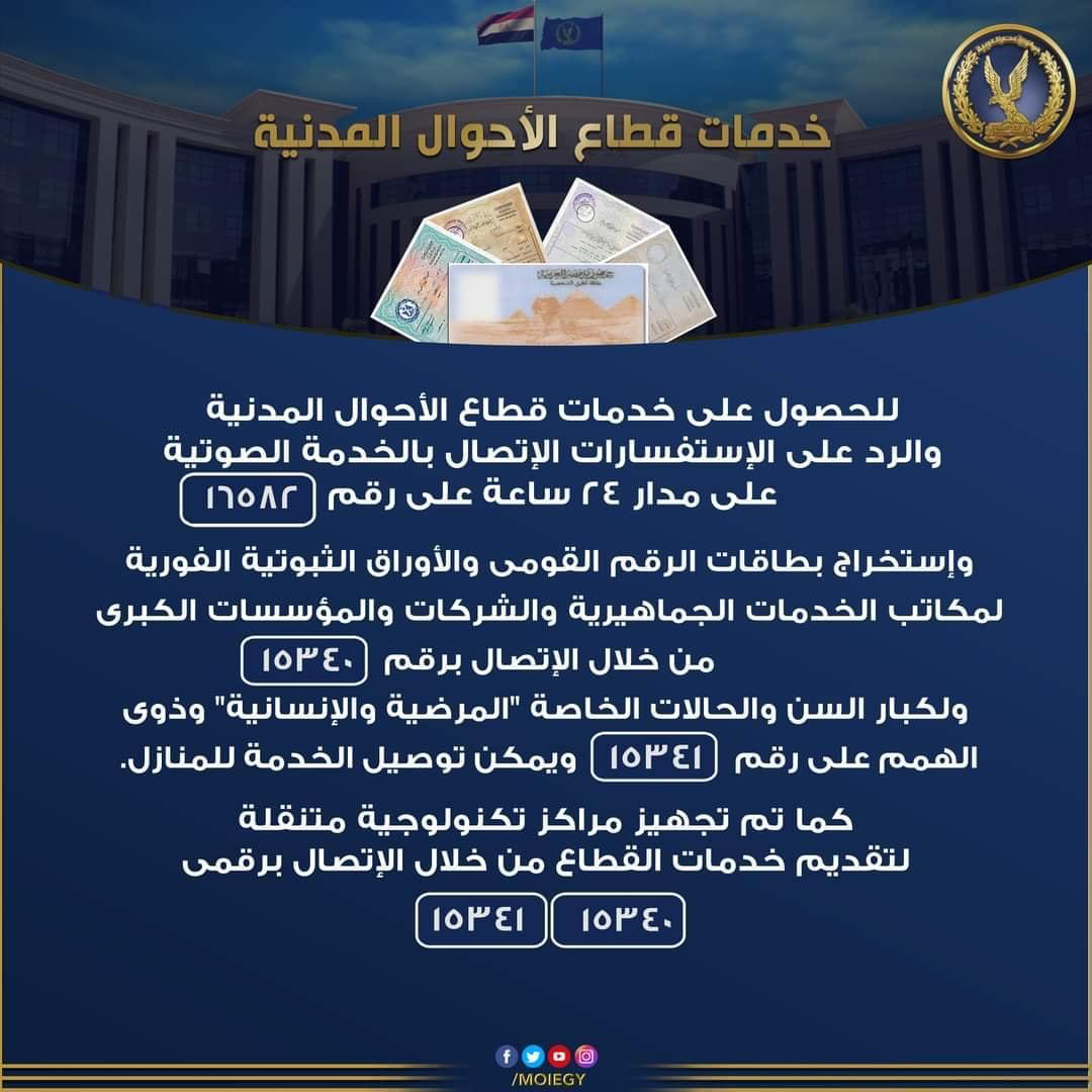 خصص قطاع الأحوال المدنية بوزارة الداخلية 5 خطوط ساخنة للحصول على خدمات القطاع والرد على الإستفسارات ، وذلك بالإتصال بالخدمة الصوتية على مدار 24 ساعة على رقم (16582)، وإستخراج بطاقات الرقم القومى والأوراق الثبوتية الفورية لمكاتب الخدمات الجماهيرية والشركات والمؤسسات الكبرى من خلال الإتصال برقم 15340.