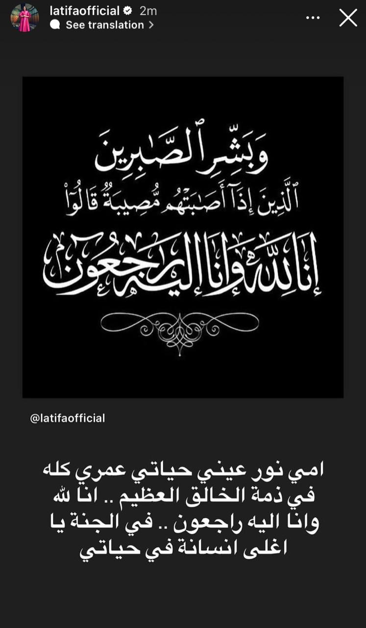 وفى أول تعليق للمطربة لطيفة كتبت عبر حسابها على إنستجرام: "أمى نور عينى حياتى عمرى كله فى ذمة الخالق العظيم .. فى الجنة يا أغلى إنسانة فى حياتى.