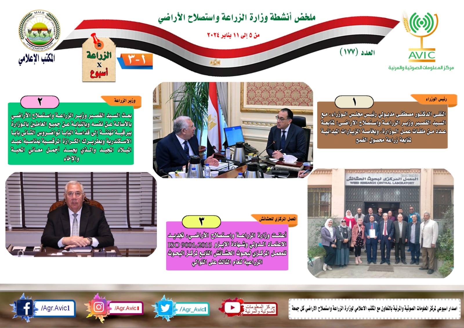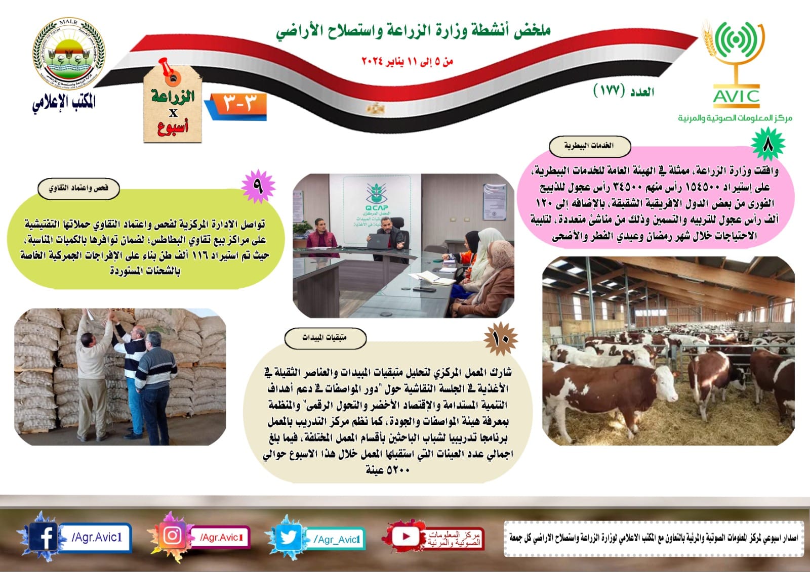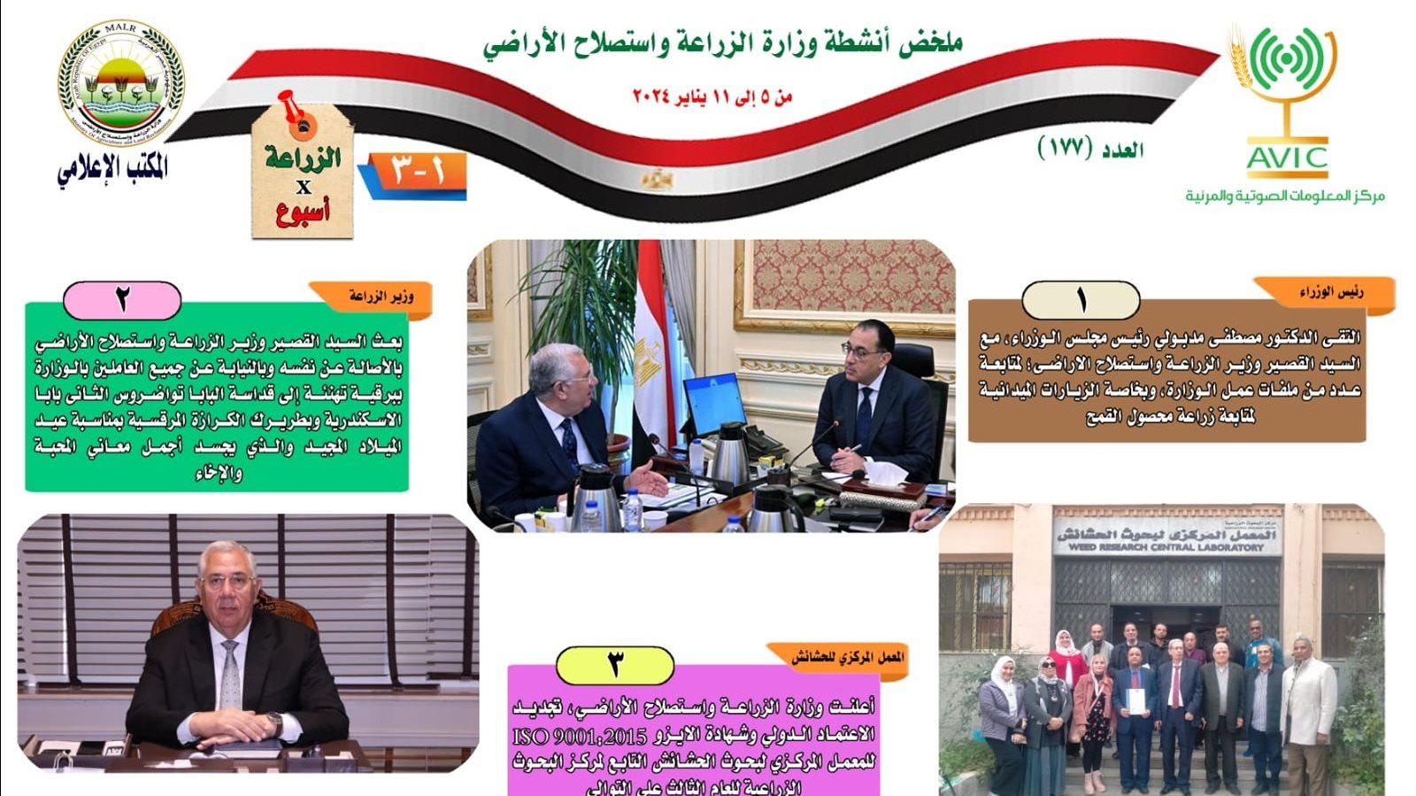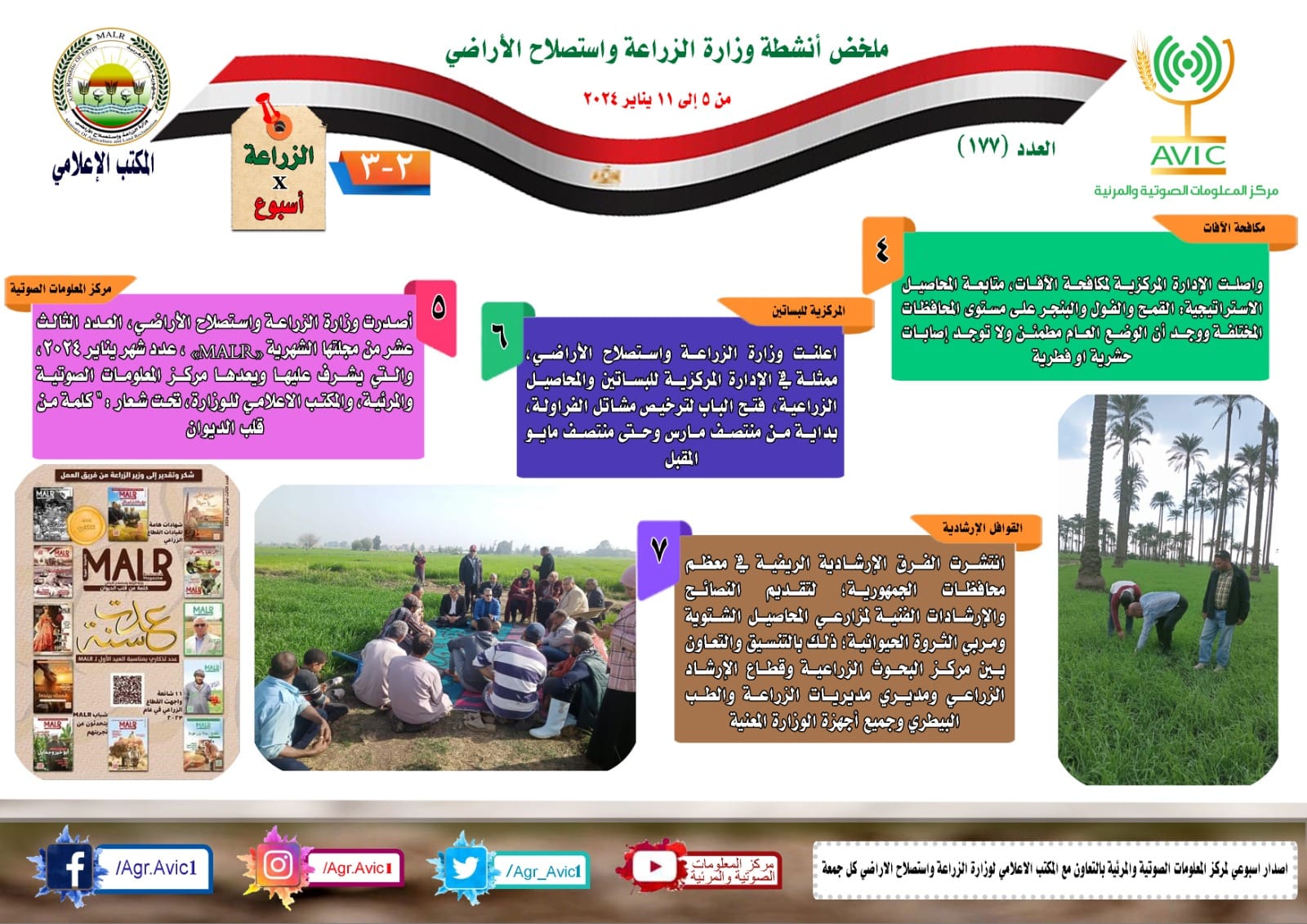 أصدر مركز المعلومات الصوتية والمرئية، التابع لوزارة الزراعة واستصلاح الاراضي، "الانفوجراف الاسبوعي" في نسخته رقم 177، حول الحصاد الاسبوعي لأهم أنشطة الوزارة، خلال الأسبوع الماضي في الفترة من 5 وحتى 11 يناير الجاري، وذلك بالتعاون مع المكتب الاعلامي للوزارة، كما أصدر المركز ايضا ملخصا بالفيديو، حول انشطة الوزارة خلال نفس الفترة.