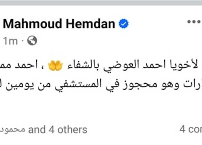 وقال محمود حمدان عبر صفحته على موقع فيسبوك : “دعواتكم لأخويا أحمد العوضي بالشفاء، أحمد ممنوع عنه الزيارات وهو محجوز في المستشفى بقاله يومين لصعوبة حالته".