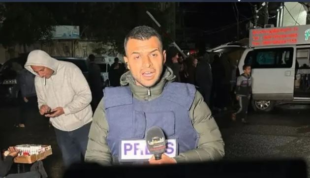 وسقط مراسل تلفزيون فلسطين عمر الداهودي على الهواء مباشرة، فيما كانت المذيعة تسأله عن الأوضاع داخل قطاع غزة.