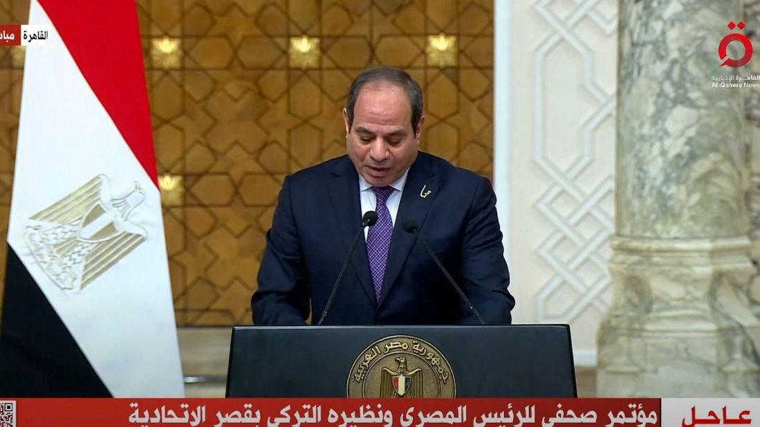 وقال الرئيس السيسي في كلمته في مؤتمر صحفي مشترك مع الرئيس التركي أردوغان، :" السلطات الإسرائيلية تمارس تضييقا على دخول المساعدات الإنسانية لقطاع غزة مما يتسبب في دخول المساعدات بوتيرة بطيئة لا تتناسب مع احتياجات سكان القطاع".