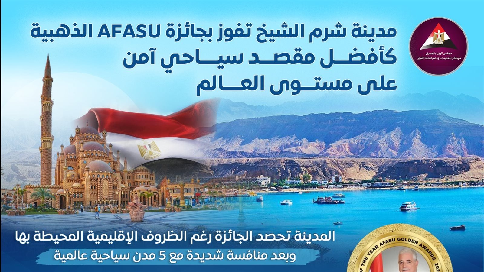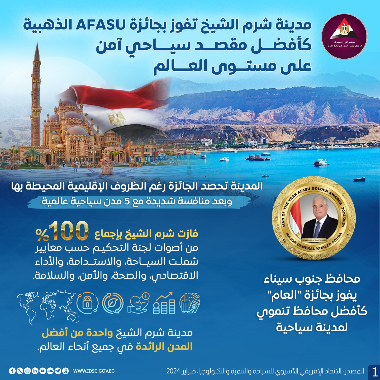 ثمن الدكتور مصطفى مدبولي، رئيس مجلس الوزراء، فوز مدينة شرم الشيخ بجائزة أفضل وجهة سياحية آمنة للزيارة في العالم، وفوز اللواء خالد فودة، محافظ جنوب سيناء، بجائزة "AFASU" الذهبية، لأفضل محافظ قائد للتنمية لمدينة سياحية في العالم "رجل العام"، وذلك ضمن جوائز الاتحاد الأفريقي الآسيوي "AFASU" الذهبية.