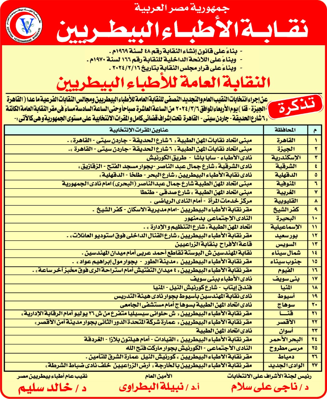 - مقعد النقيب العام للأطباء البيطريين ويكون ممن مضى على قيده بالجدول العام أكثر من 15 عاما ويتنافس عليه 13 مرشحاً.