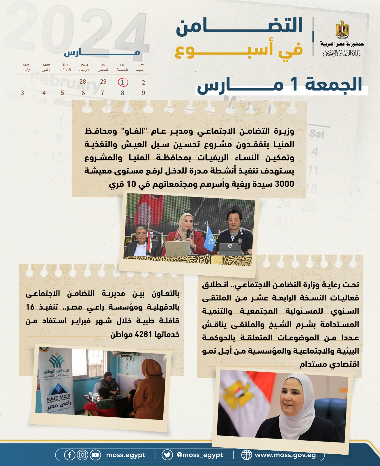 - وزيرة التضامن الاجتماعي ومدير عام "الفاو" ومحافظ المنيا يتفقدون مشروع تحسين سبل العيش والتغذية وتمكين النساء الريفيات بمحافظة المنيا والمشروع يستهدف تنفيذ أنشطة مدرة للدخل لرفع مستوى معيشة 3000 سيدة ريفية وأسرهم ومجتمعاتهم في 10 قري.
