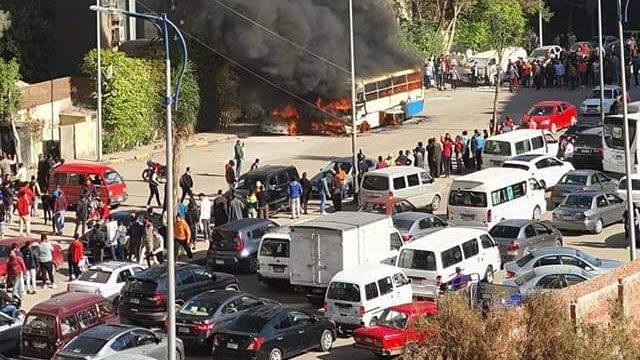 اصطدم أتوبيس نقل بسيارة أجرة في شارع اللبيني بمنطقة فيصل ما أسفر عن اشتعال النيران بالأتوبيس.