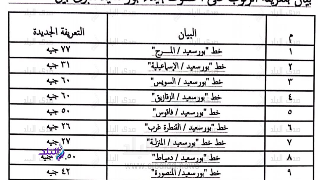 والسرفيس داخل المحافظة 3,25 جنيها ، مشروع النقل الداخلي 2,75 جنيها ، خط بورسعيد بورفؤاد 5 جنيهات ، وخط الحي الاماراتي 4جنيهات خط الدببة 9جنيهات ، خط شادر عزام 14,50جنيها ، خط القابوطي الجديد /٤٤ عمارة بسعر 5,50 جنيهات .