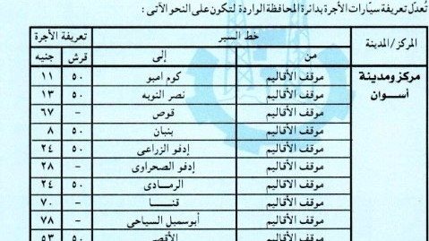 وأعطى اللواء أشرف عطية محافظ أسوان توجيهاته لإدارتى المرور ومشروع المواقف بالمحافظة ، وأيضاً نقابة العاملين بالنقل البرى بالقيام بالمتابعة الميدانية المستمرة لمراعاة تطبيق التعريفة الجديدة ، والتى تم إقرارها وتنفيذها من صباح اليوم الجمعة 22 مارس الجارى وفقاً لقرارات لجنة التسعير التلقائى للمنتجات البترولية بشأن تصحيح أسعار هذه المنتجات ، والتى زادت بنسبة من 10% إلى 15 % على خطوط السير المختلفة بنطاق محافظة أسوان ، وبنسبة 10 % على التاكسى مع التأكد من تسليم السائقين الكارتات والتعامل مع أي مشاكل لجمهور الركاب ، على أن يتم بالتوازى وضع التعريفة الجديدة على زجاج كل سيارة ، والإطمئنان من المواطنين أنفسهم على إلتزام السائقين بالتعريفة المقررة .