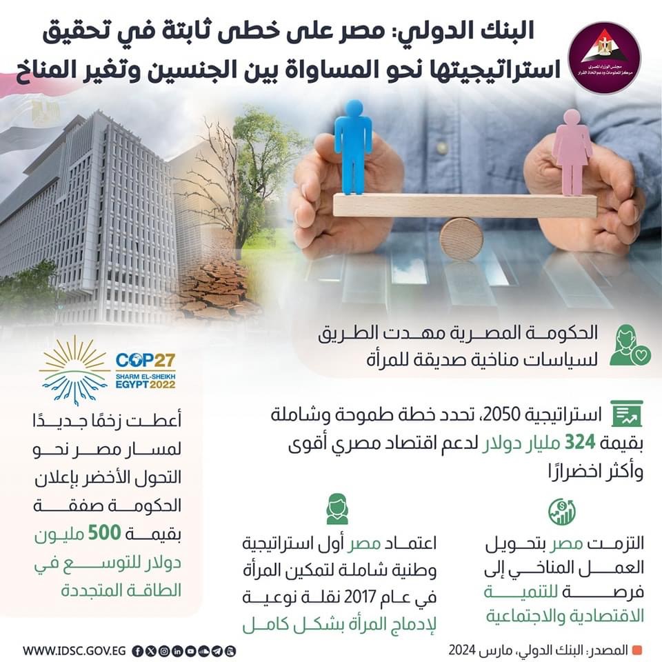 وأوضح الانفوجراف انه وفقًا لتقرير البنك الدولي "مصر - المساواة بين الجنسين وتغير المناخ "، الصادر في مارس 2024؛ فإن استراتيجية 2050، التي تم إطلاقها في مايو 2022، تحدد خطة طموحة وشاملة بقيمة 324 مليار دولار لدعم اقتصاد مصري أقوى وأكثر اخضرارًا.