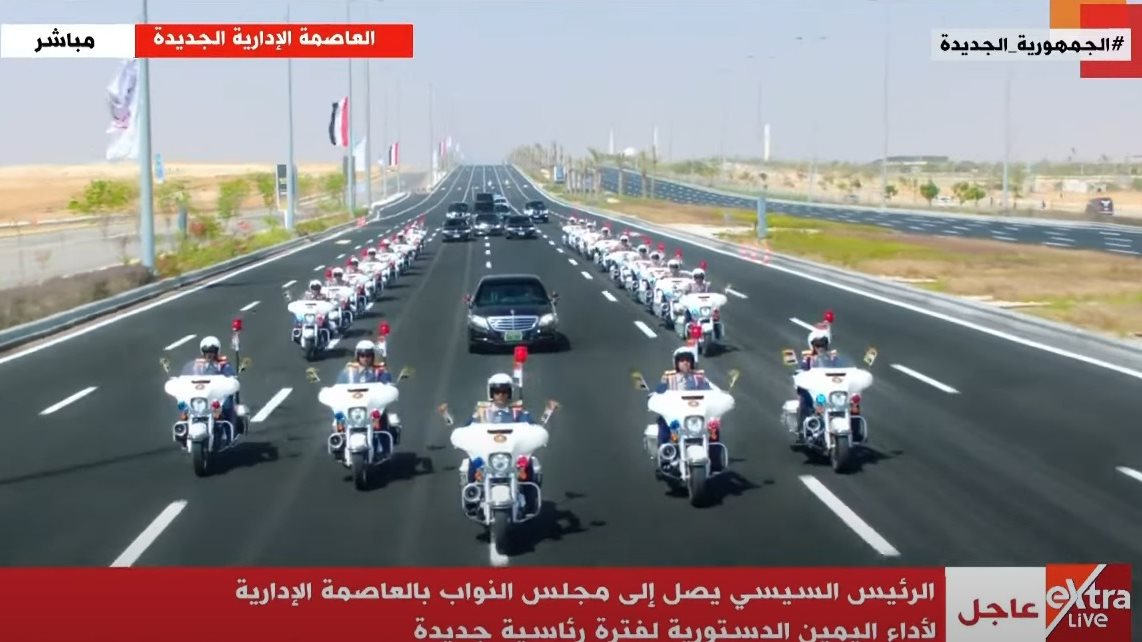 وأظهرت اللقطات الحية تحرك الرئيس السيسي في موكب مهيب في طريقه لمجلس النواب بالعاصمة الإدارية الجديدة.