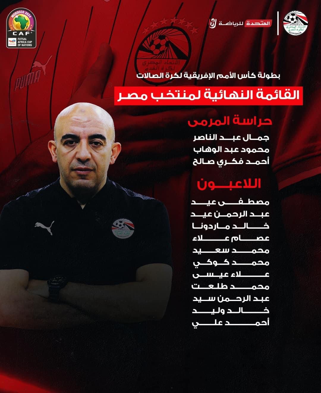 اختار جهاد عرفة المدير الفنى لمنتخب مصر لكرة الصالات القائمة النهائية للاعبين التى تشارك فى بطولة كأس الأمم الإفريقية التى تقام فى المغرب أبريل الجارى.