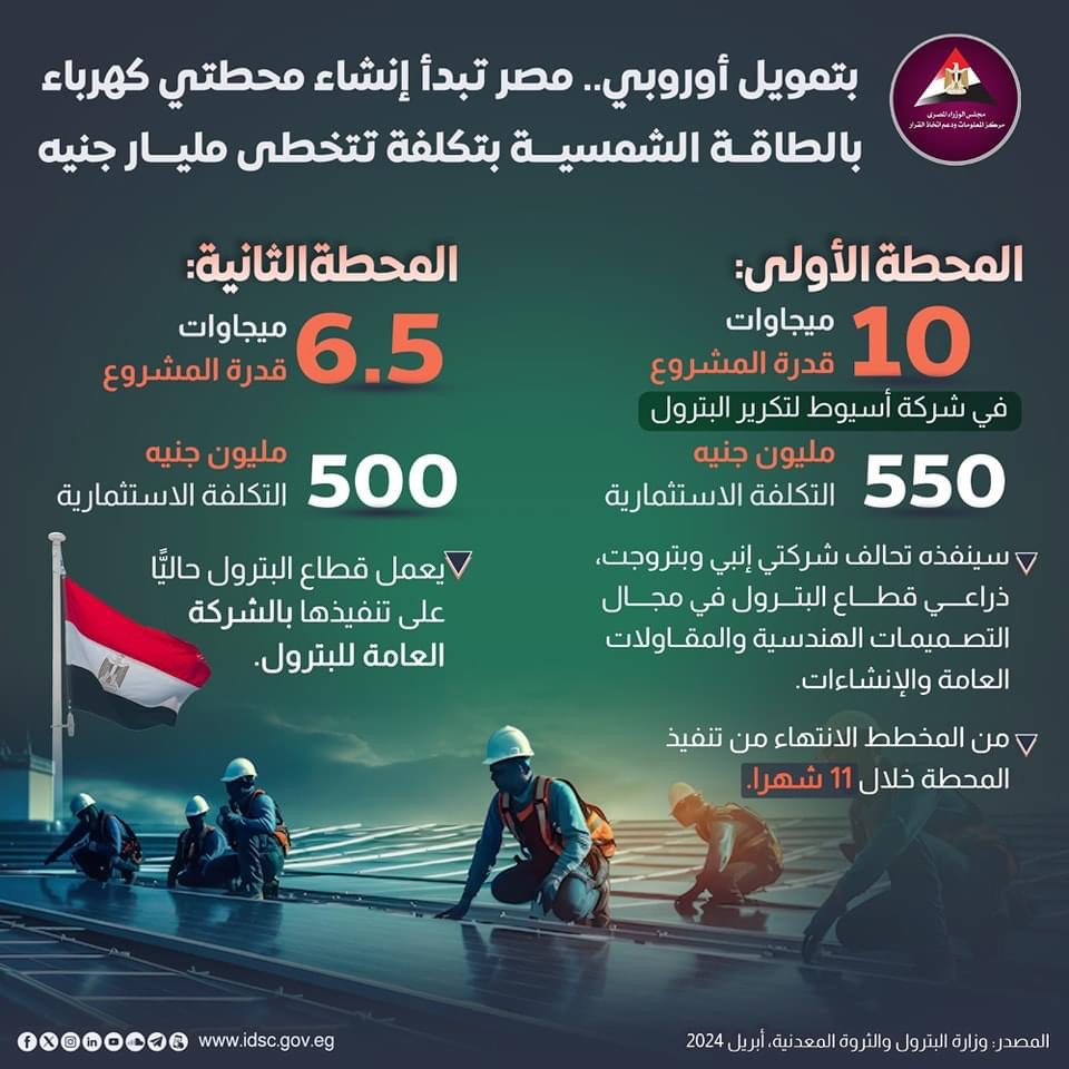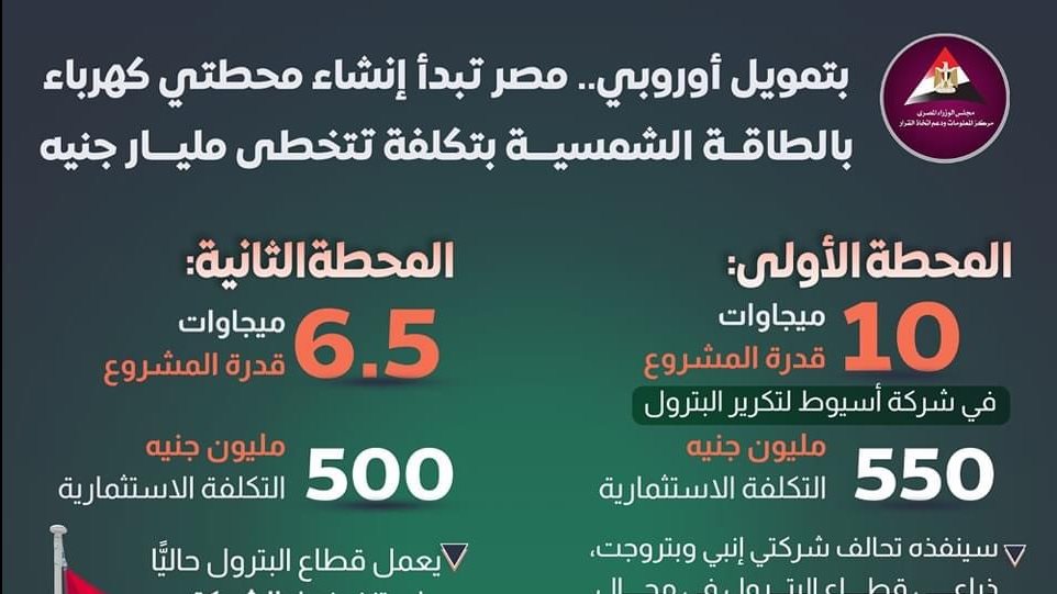 واوضح الانفوجراف ان مصر تبدا انشاء محطتي كهرباء بالطاقة الشمسية بتكلفة تخطي مليار جنيه بتمويل اوروبي .