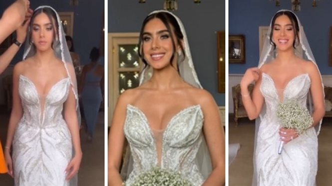 واعتمدت على مكياج بسيط مناسب للفستان وارتدت طرحة علي شعرها وإليكم الصور.