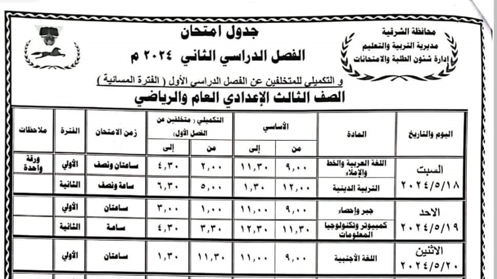 جدير بالذكر ان غدا الاحد يؤدي طلاب الشهادة الإعدادية امتحان مادة الجبر والاحصاء فترة اولي ومادة كمبيوتر وتكنولوجيا المعلومات فترة ثانية.