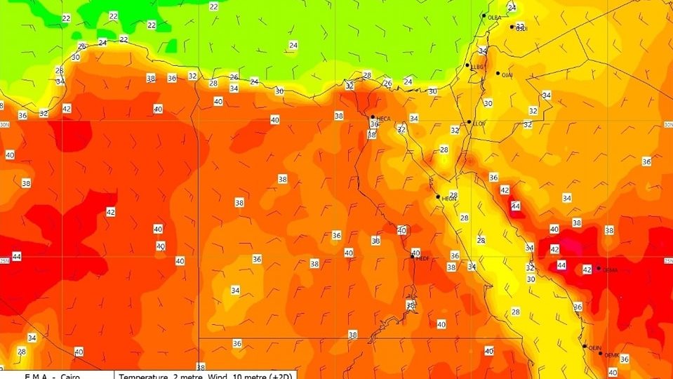 أعلنت هيئة الأرصاد الجوية عن انخفاض مؤقت في درجات الحرارة على أغلب الأنحاء يومي الأحد والإثنين، بقيم تتراوح من (5-3) درجات على أغلب الأنحاء إذ يسود اليوم طقس حار نهاراً على السواحل الشمالية والوجه البحري والقاهرة الكبرى شديد الحرارة على جنوب سيناء وجنوب البلاد ، أما ليلاً فتكون الأجواء معتدلة شمالا مائلة للحرارة جنوباً، واعتبارا من الثلاثاء ارتفاع تدريجي في درجات الحرارة على أغلب الأنحاء يستمر حتى يوم عرفة وأيام عيد الأضحى، حيث تصل الحرارة إلى 45 درجة الجمعة المقبل على الجنوب.