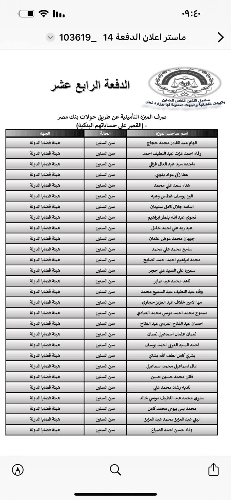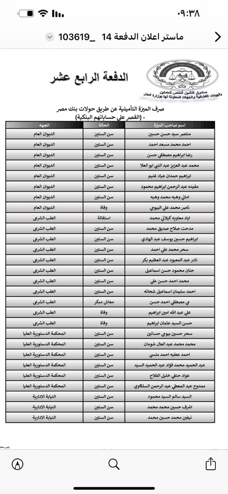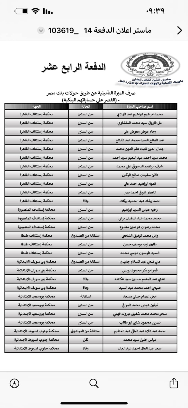 قال كريم عبدالباقي رئيس النقابة العامة للعاملين بالنيابات والمحاكم ورئيس مجلس إدارة صندوق التأمين الخاص للعاملين بالهيئات القضائية والجهات المعاونة لها، إن مجلس الإدارة وافق على صرف دفعة جديدة من مستحقات أعضاء الصندوق ممن بلغوا سن المعاش وآخرين كلاً حسب حالة الصرف، وهي الدفعة الرابعة عشر منذ إنتخاب مجلس إدارة الصندوق في فبراير 2023 وخلال عام ونصف فقط قد أنتهي مجلس إدارة الصندوق من صرف كل المستحقات المتأخرة بالنسبة للأعضاء مستحقي الصرف.