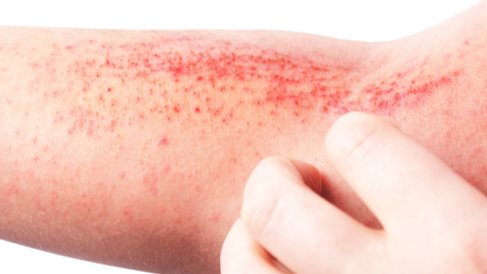 -الجلد الملتهب، الذي يبدو ورديًا أو أحمرًا على الجلد الأبيض، وقد يصعب رؤيته على الجلد البني أو الأسود.